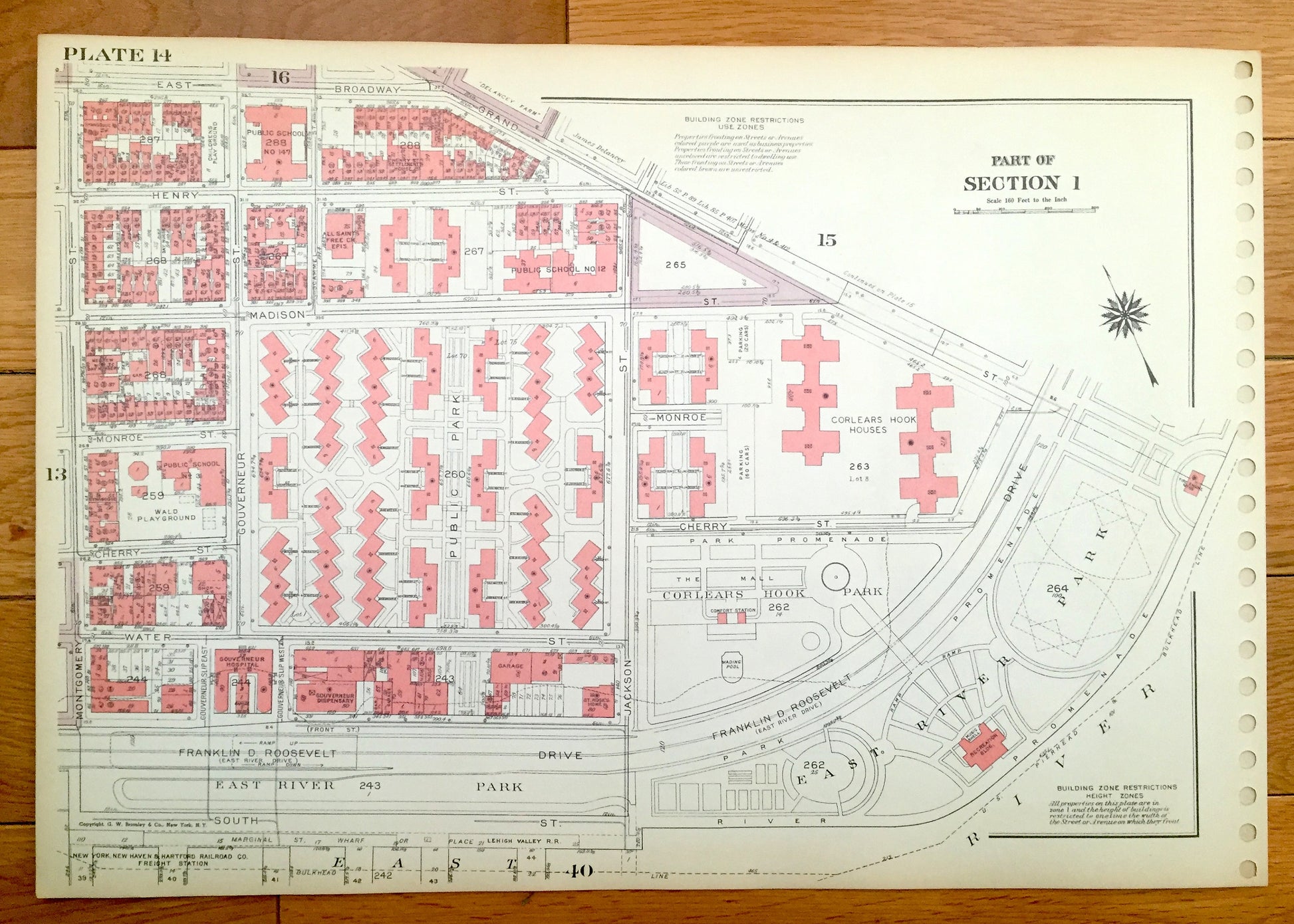 Antique Manhattan, New York Map from Bromley's 1955 Manhattan Land Book – Lower East Side, Two Bridges, Laguardia & Corlears Hook Houses NYC