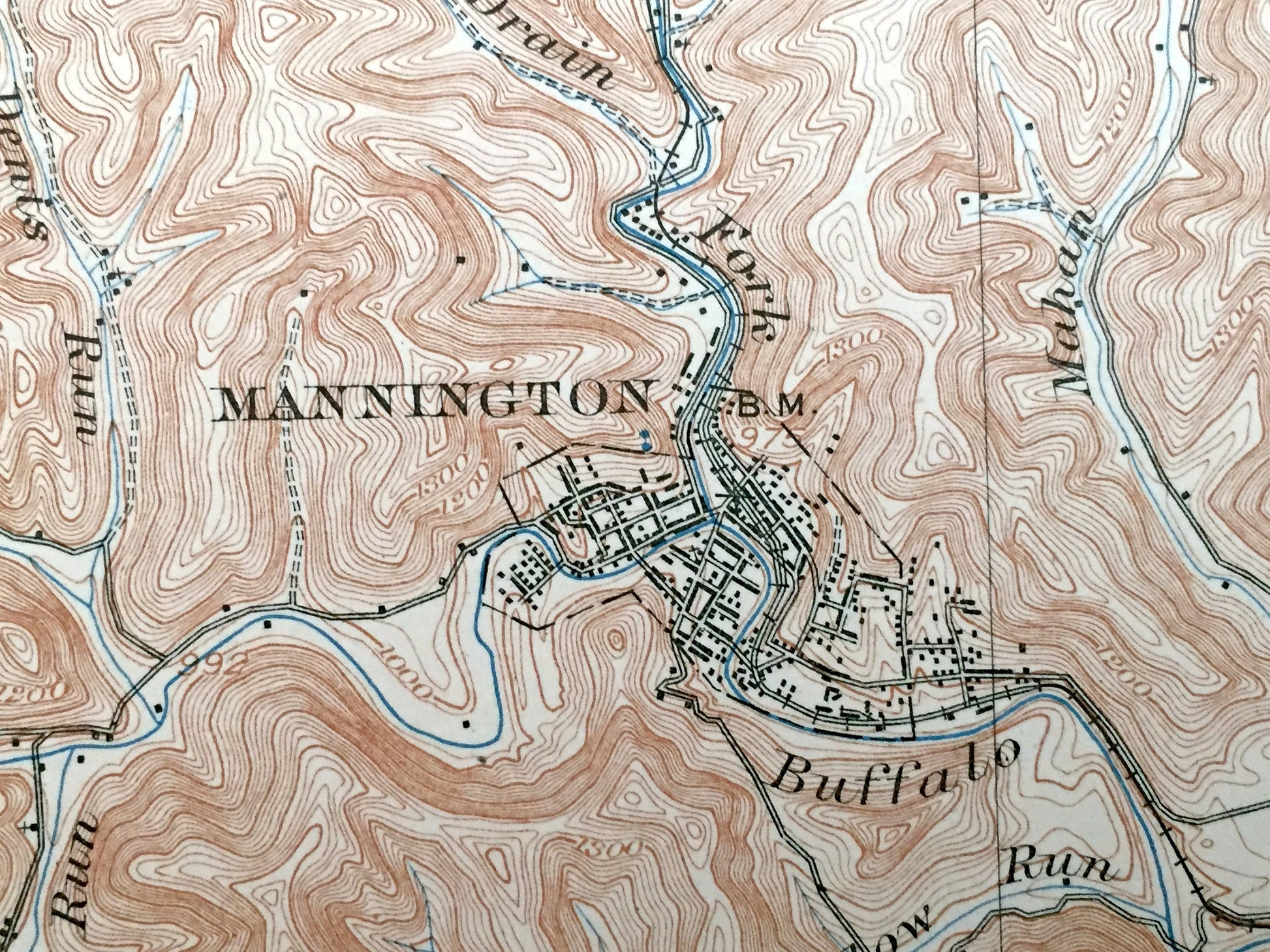 Beautiful, antique map of Mannington, West Virginia and surrounding Pennsylvania and Marion, Wetzel, Monongalia, and Greene County area. This is an authentic 1905 print from the U.S. Geological Survey and NOT a computer reproduction.