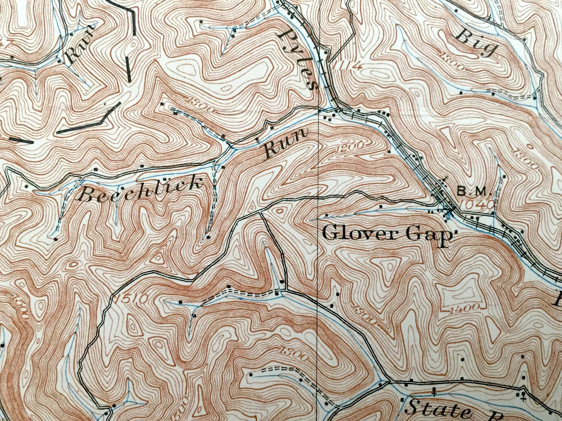 Points of Interest: Baltimore & Ohio Railroad, West Virginia Fork Fish Creek, Honsocker Knob, Efaw Knob, and lots more hills, mountains, creeks, towns, roads and train tracks.