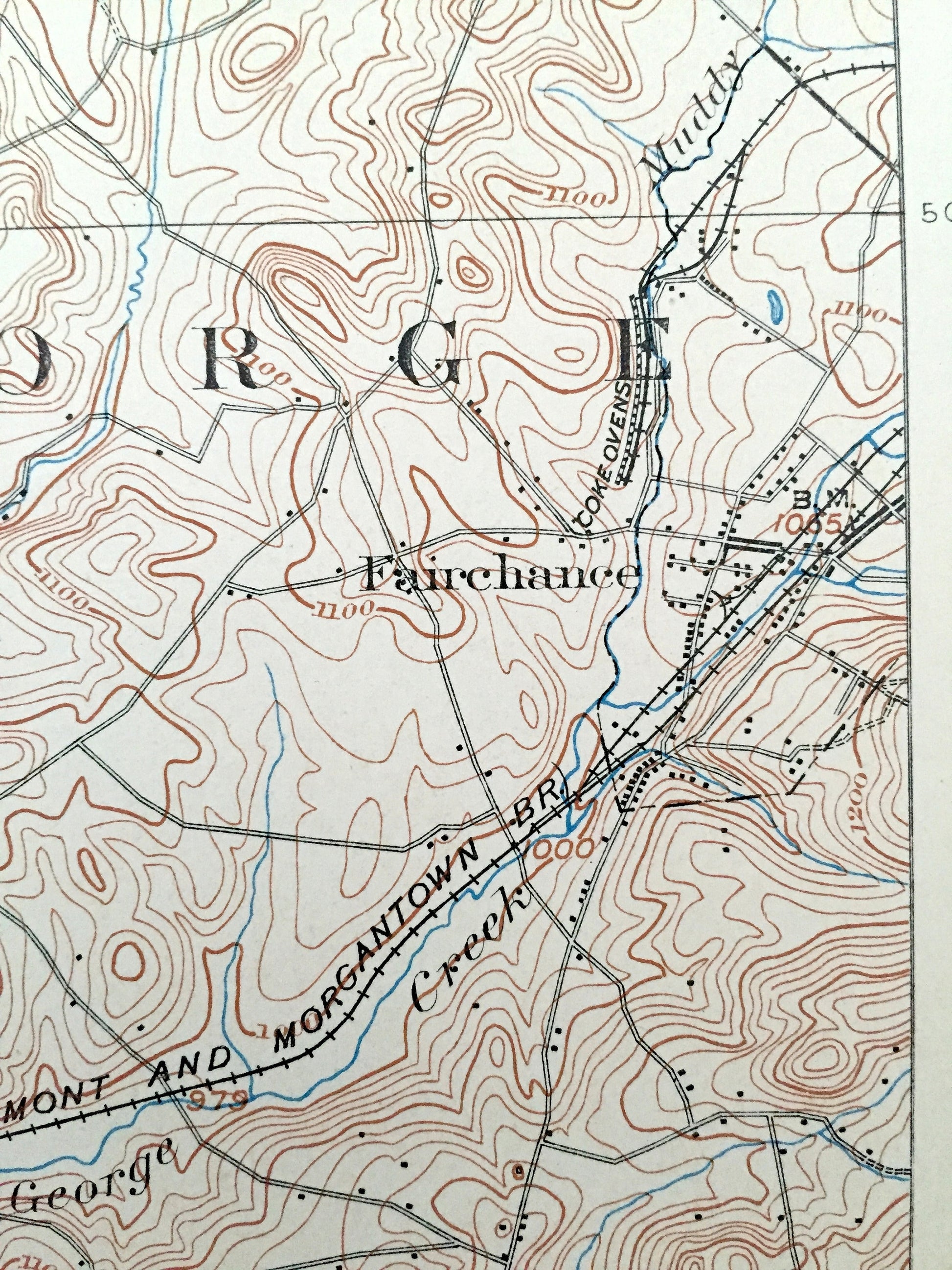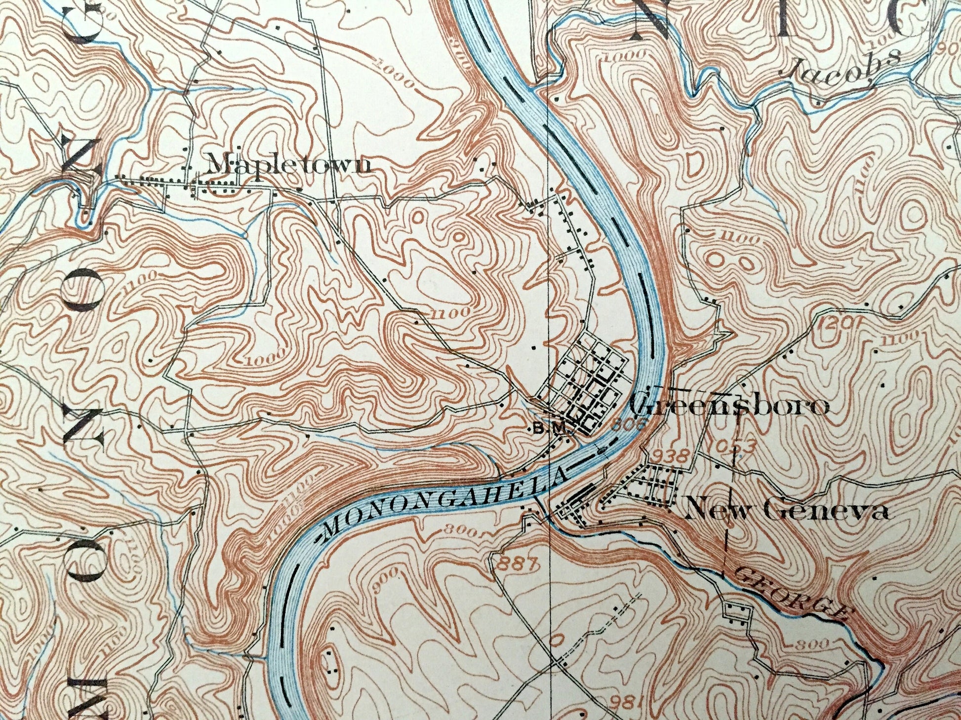 Points of Interest: Monongahela River, Baltimore & Ohio Railroad, Jacobs Creek, Turkey Knob, Dunkard Creek, and lots more hills, mountains, creeks, towns, roads and train tracks.