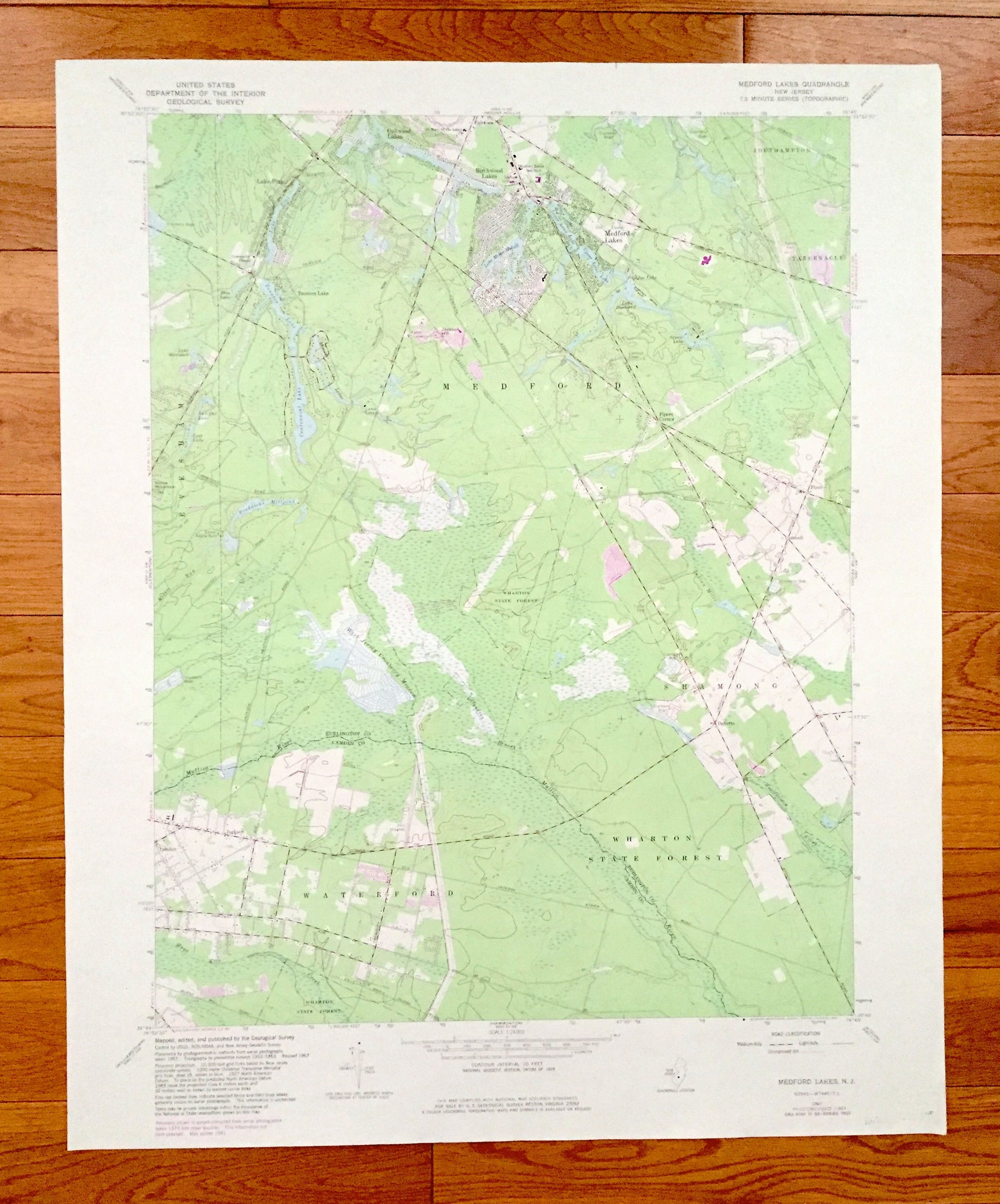 Beautiful, antique map of Medford Lakes, New Jersey and surrounding Burlington County and Camden County areas. This is an authentic 1967 edition, 1982 print from the U.S. Geological Survey and NOT a computer reproduction.