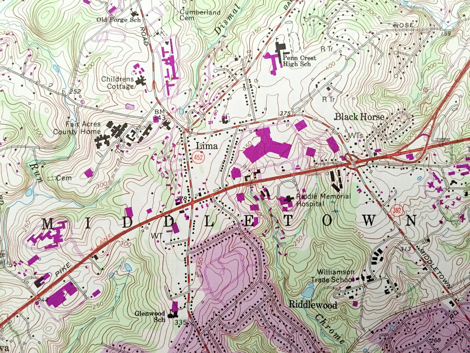 Points of Interest: Geist Reservoir, Ridley Creek State Park, Hunting Hill, Edgemont Golf Club, Dominican Convent, Williamson Trade School, Sleighton Farm School, Ridley Creek, Tyler Arboretum, Dismal Run, Penn Central Railroad, Chester Creek, Long Point, Rose Tree Park, Chrome Run, Crum Creek, and many more hills, streams, ponds, houses, schools, railroads, churches and roads.