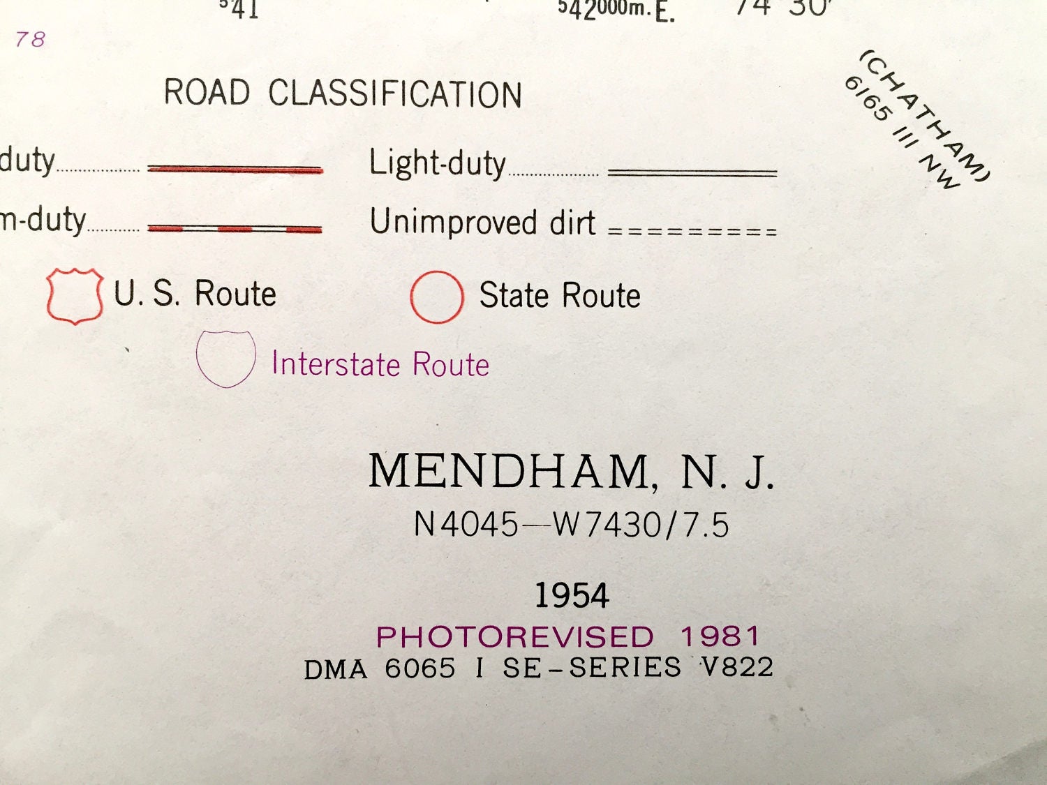 Beautiful, antique map of Mendham, Randolph, Mount Freedom, Mine Hill, Denville and Harding, New Jersey. This is an authentic 1981 print of 1954 survey data from the U.S. Geological Survey and NOT a computer reproduction.