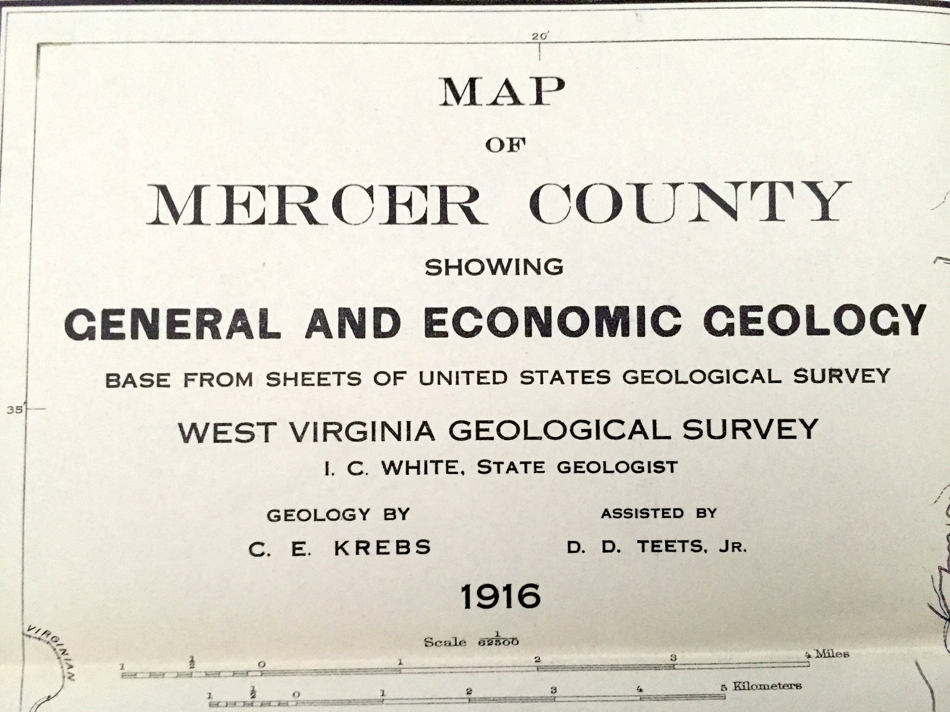Beautiful, antique contour "General & Economic Geology" map of Mercer County, West Virginia. This is an authentic 1916 print from the Maryland and US Geological Survey and is NOT a computer reproduction. This map is very large and would be the focus of any wall where it is hung. (See coin in corner to get an idea of the scale.)