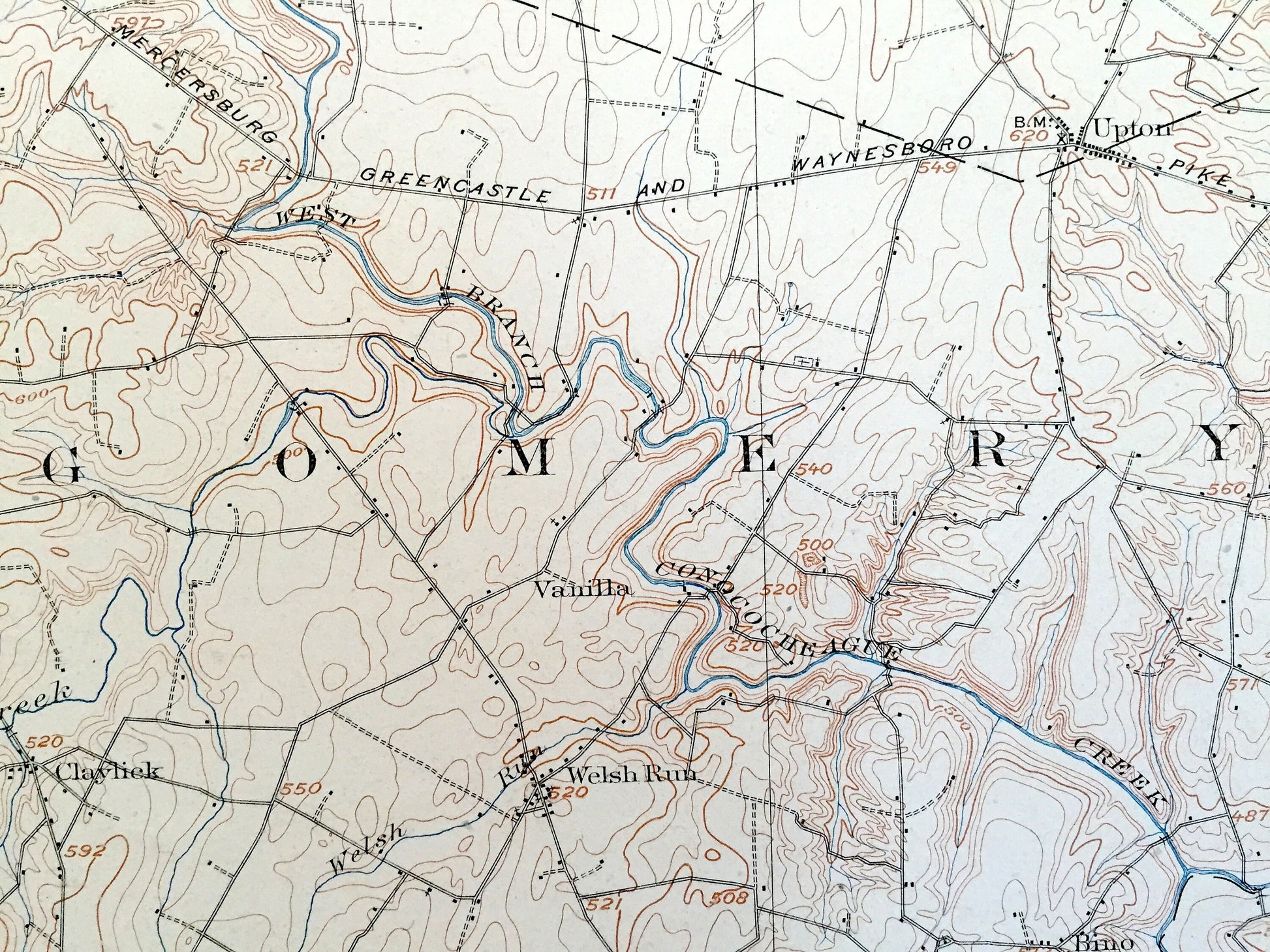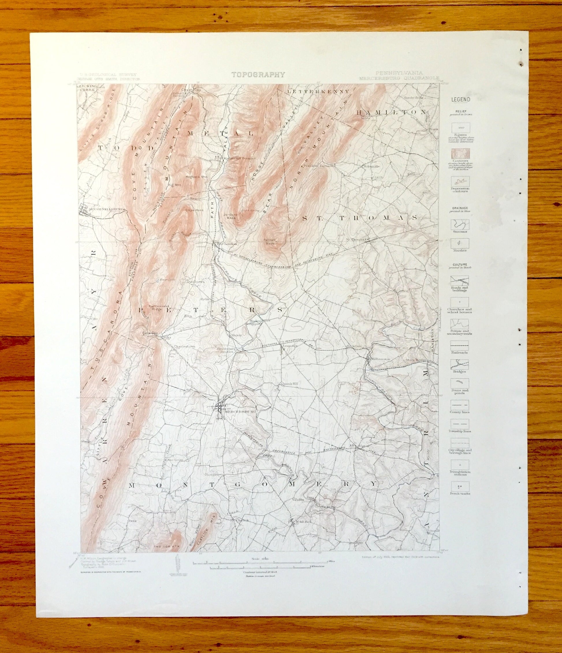 Beautiful, antique map of Mercersburg, Pennsylvania and surrounding Franklin County & Fulton County area. This is an authentic 1902 edition, 1909 print from the U.S. Geological Survey and NOT a computer reproduction.