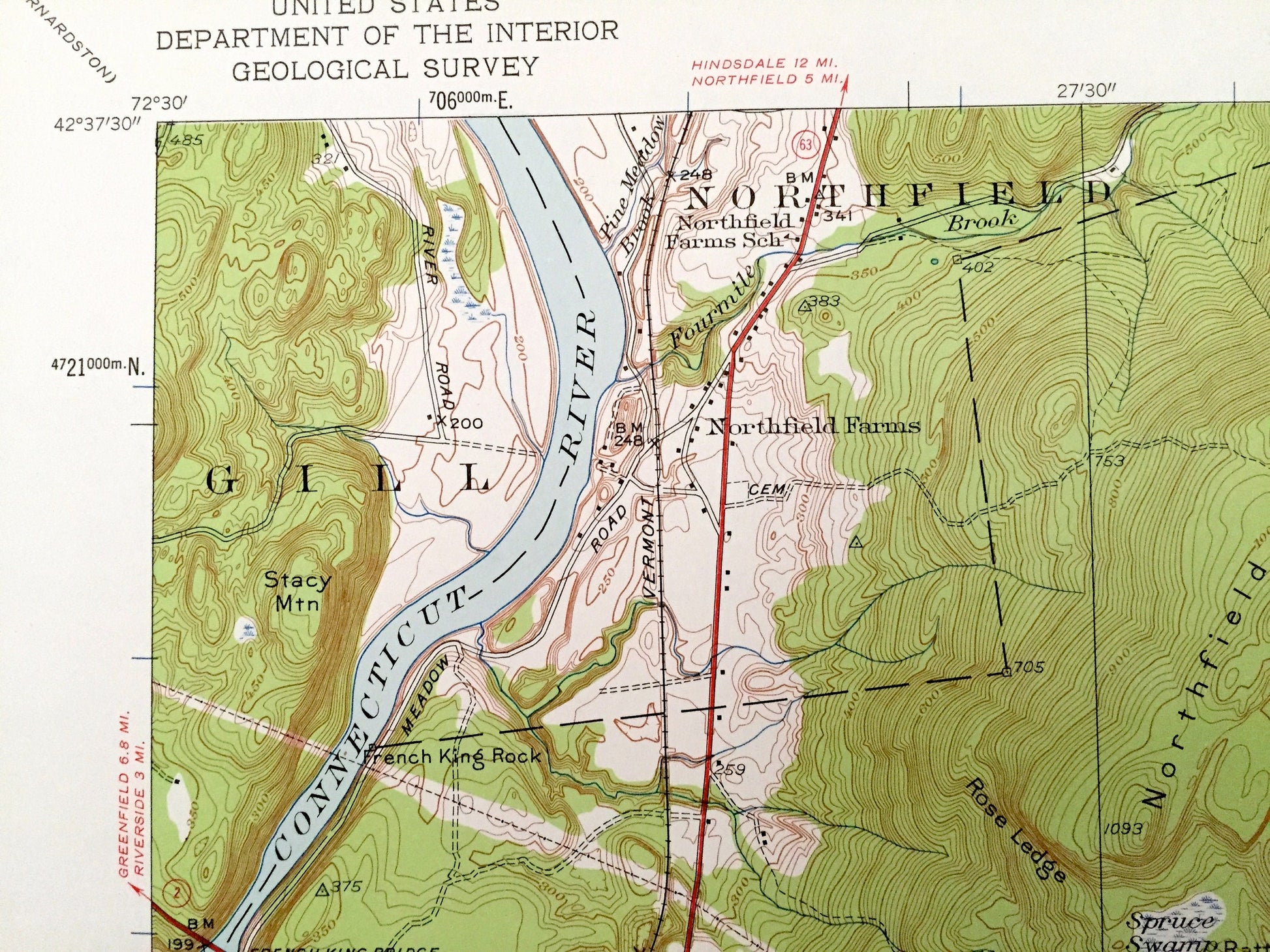 Points of Interest: Northfield Mountain, French King Bridge, French King Rock, Stacy Mountain, Poplar Mountain, Rattlesnake Mountain, Hermit Mountain, Bear Mountain, Country Hill, Chestnut Hill, Orcutt Hill, Ames Hill, Beech Hill, Laurel Lake, Bowens Pond, Wickett Pond, Lake Wyola, Connecticut River, Millers River, Spaulding Brook, and many more hills, streams, ponds, houses, schools, railroads, churches and roads.