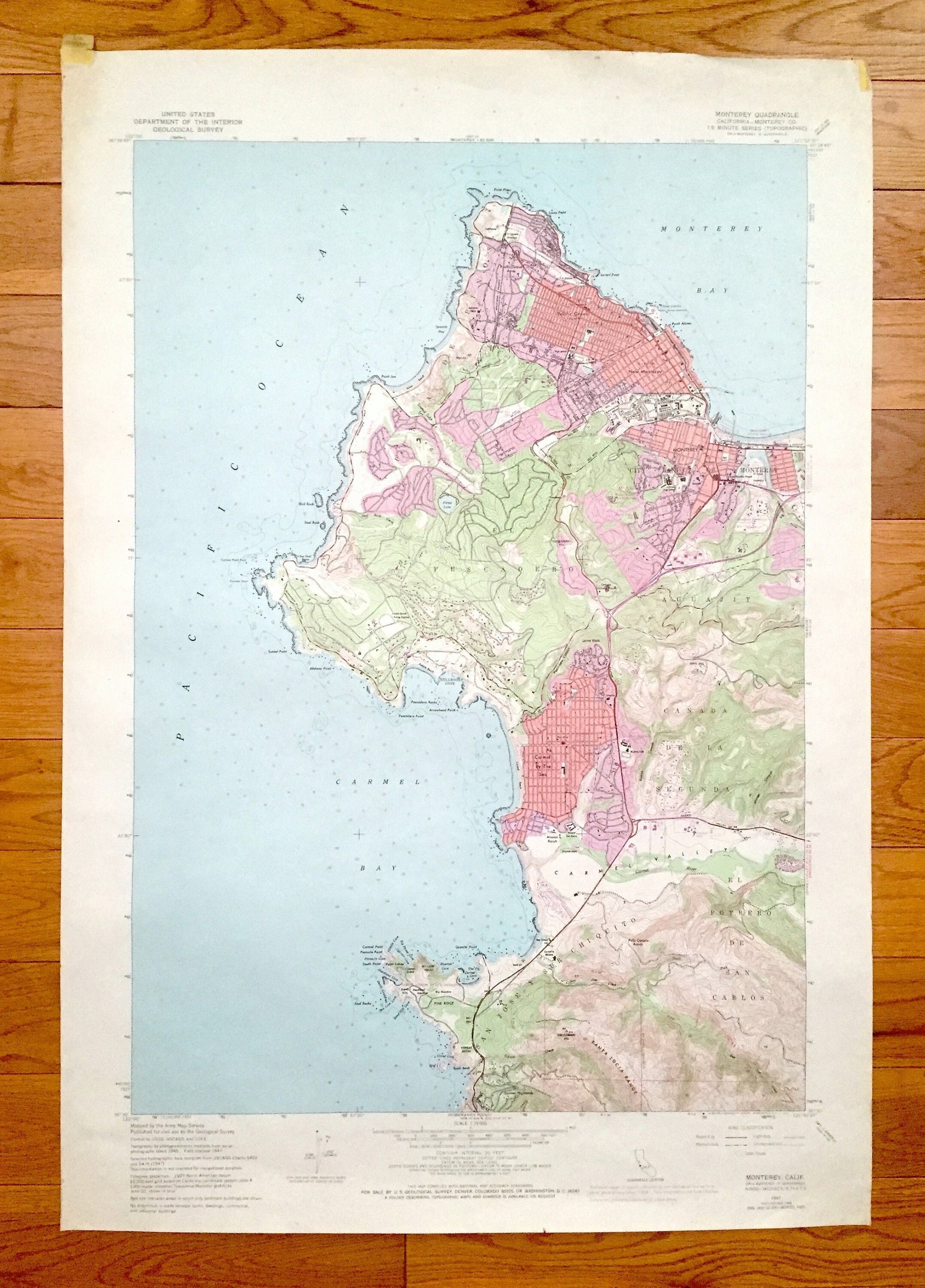 Beautiful, antique map of Monterey, California and surrounding area. This is an authentic 1947 edition, 1969 print from the U.S. Geological Survey and is NOT a computer reproduction.