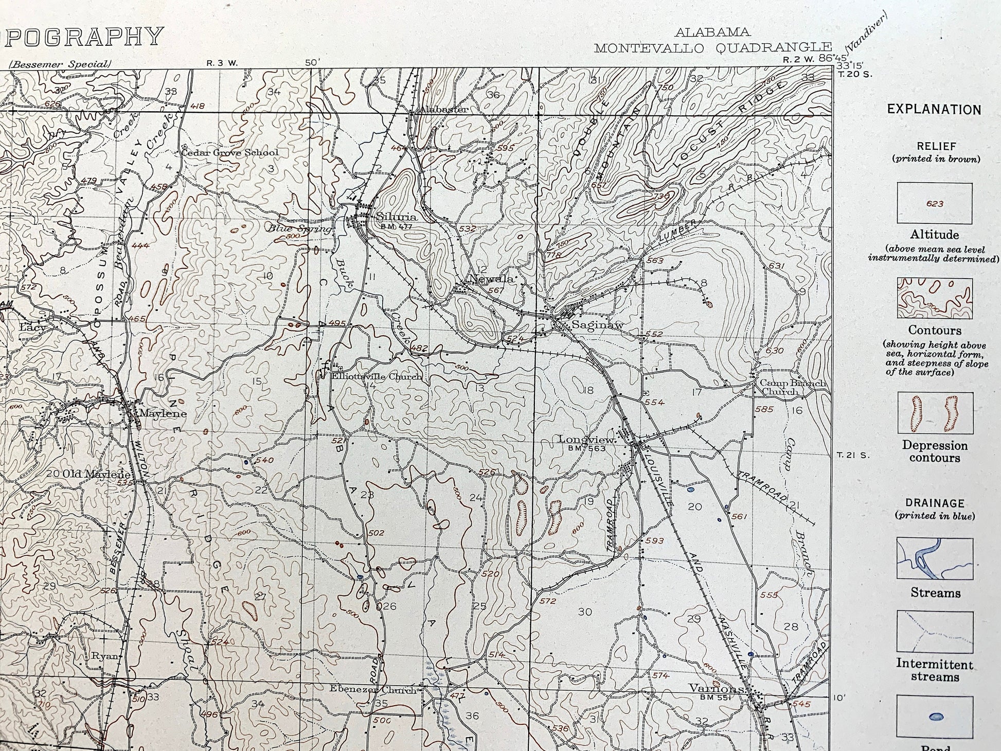 Points of Interest: Shelby County, Bibb County, Chilton County, Mahan Creek, Cahaba River, Double Mountain, Locust Ridge, Opossum Valley, Pea Ridge, Shoal Creek, Pine Ridge, Cahaba Valley, and lots more hills, mountains, creeks, towns, roads and train tracks.
