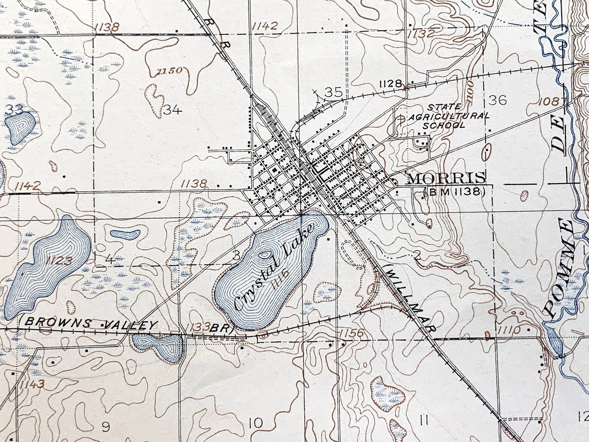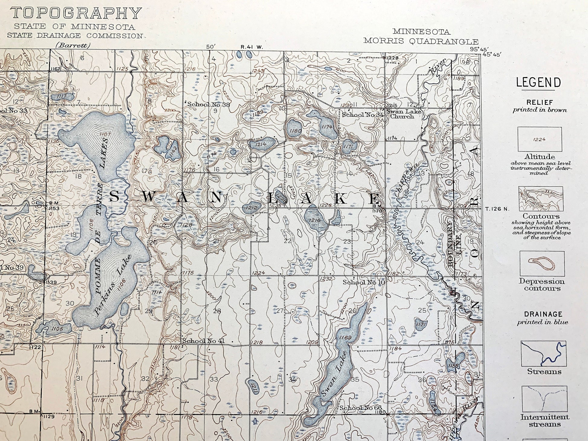Beautiful, antique map of Morris, Minnesota and surrounding Pope County and Stevens County areas. This is an authentic 1912 edition, 1916 print from the U.S. Geological Survey and NOT a computer reproduction. It is from a Geologic Atlas folio.