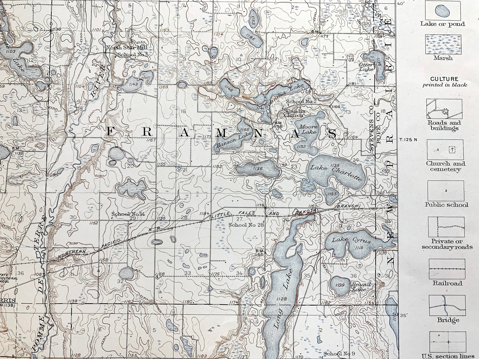 Points of Interest: Big Stone County, Stevens County, Pomme de Terre River, Crystal Lake, Page Lake, Long Lake, Perkins Lake, Pomme de Terre Lakes, Swan Lake, Lake Cyrus, Lake Charlotte, Hanson Lake, Scandia Lake, Wintermute Lake, old railroad lines, and many more hills, streams, ponds, houses, schools, railroads, churches and roads.