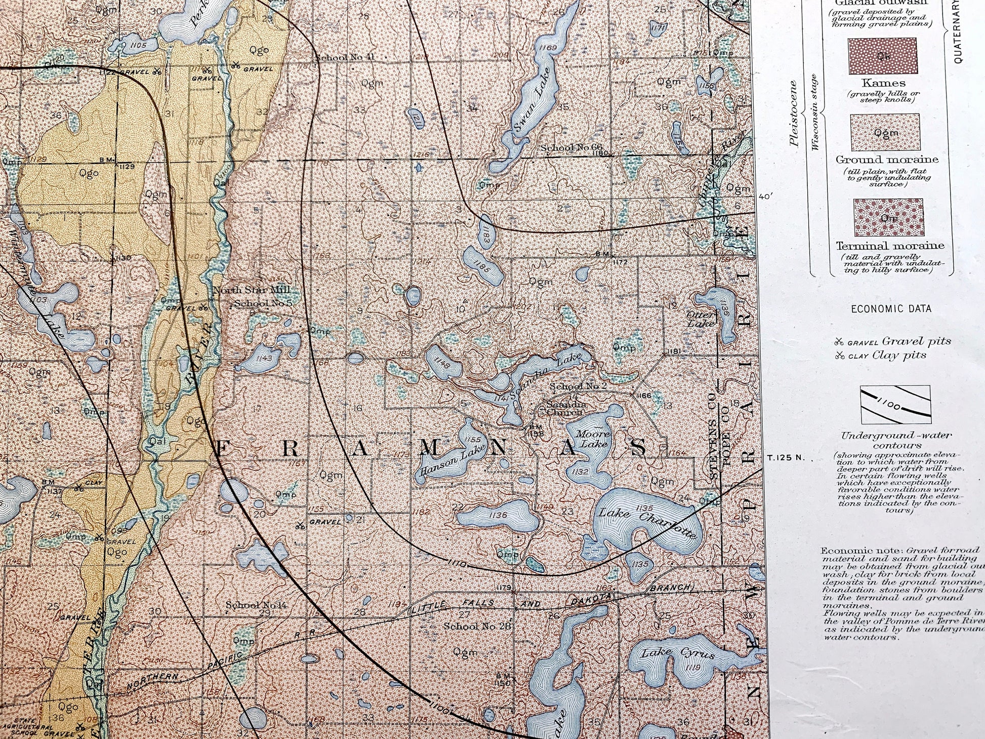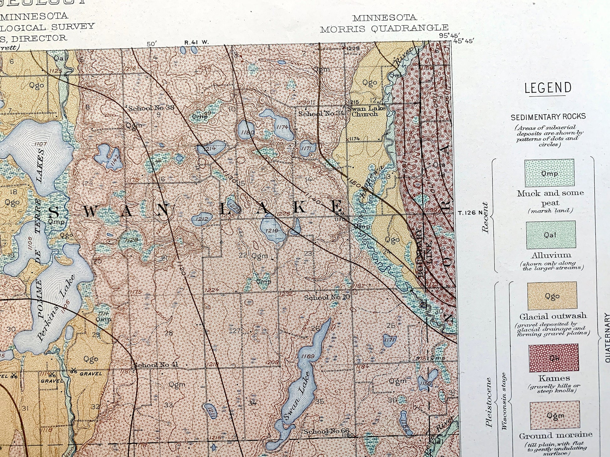 Beautiful, antique Areal Geology map of Morris, Minnesota and surrounding Pope County and Stevens County areas. This is an authentic 1917 edition, 1917 print from the U.S. Geological Survey and NOT a computer reproduction. It is from a Geologic Atlas folio.