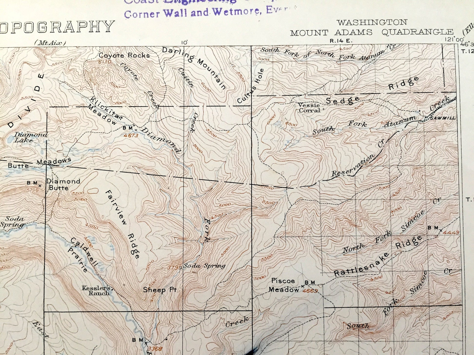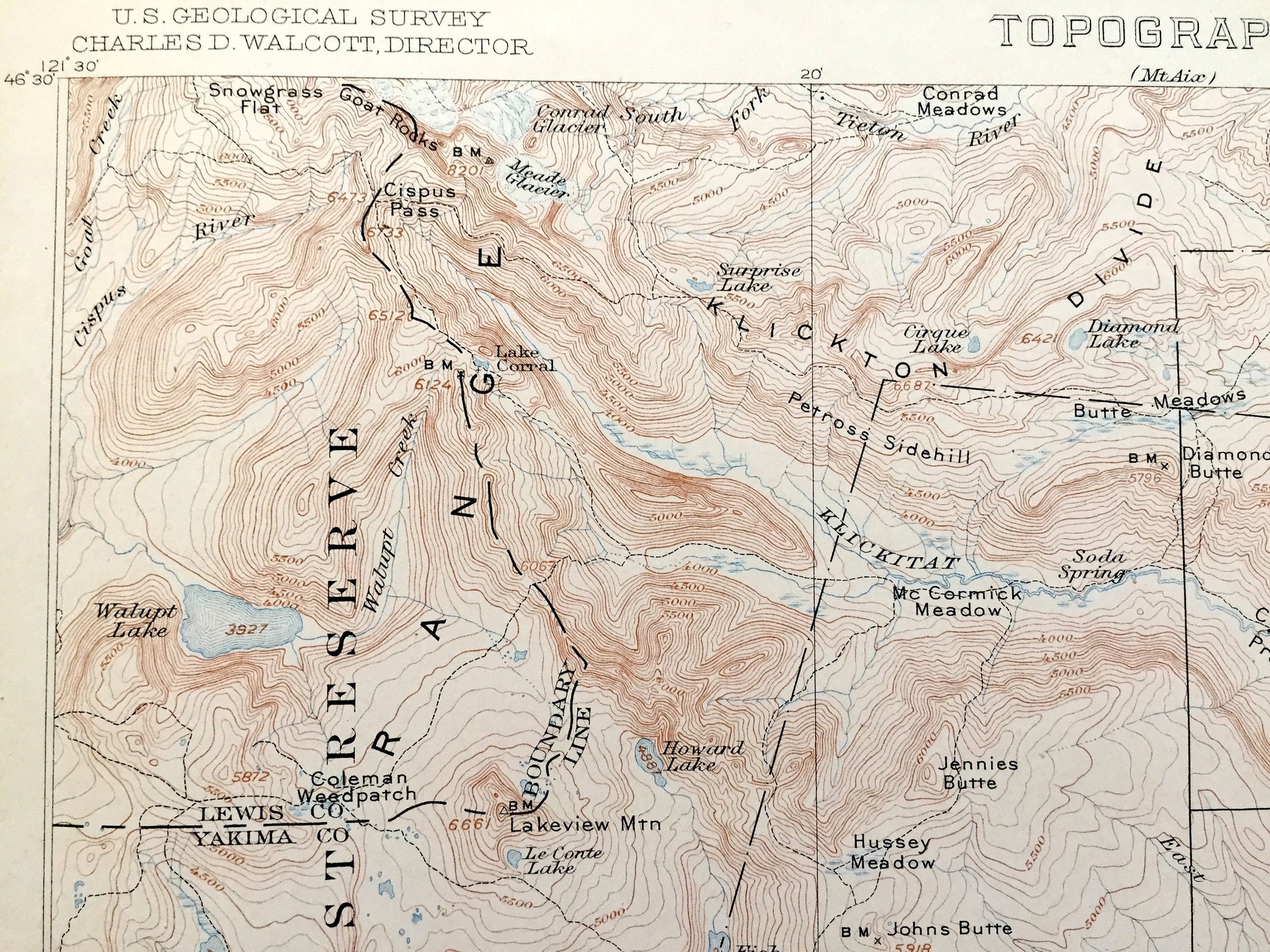 Points of Interest: Yakima County, Lewis County, Klickitat County, Mount Adams, Cascade Range, Mount Rainier National Park, Yakima Indian Reservation, Kickton Divide, Lost Horse Plateau, Peavine Ridge, The Island, Cedar Valley, Lincoln Plateau, Klickitat River, Pinegrass Ridge, Goat Butte, Signal Peak, Klickitat Glacier, South Butte, Pinnacle Glacier, Adams Glacier, Avalanche Glacier, Hellroaring Creek, Jungle Butte, Bullgrouse Ridge, Fish Lake Stream, Lakeview Mountain, Walupt Lake, Bird Creek, Parrotts Bridge, Grouse Pass, Shaw Mountain, Squirrel Pass, Bird Creek, Soda Ford, Toppenish Creek, Caldwell Prairie, Coleman Weedpatch, Mulligan Butte, King Mountain, and lots more hills, mountains, creeks, towns, roads and train tracks.