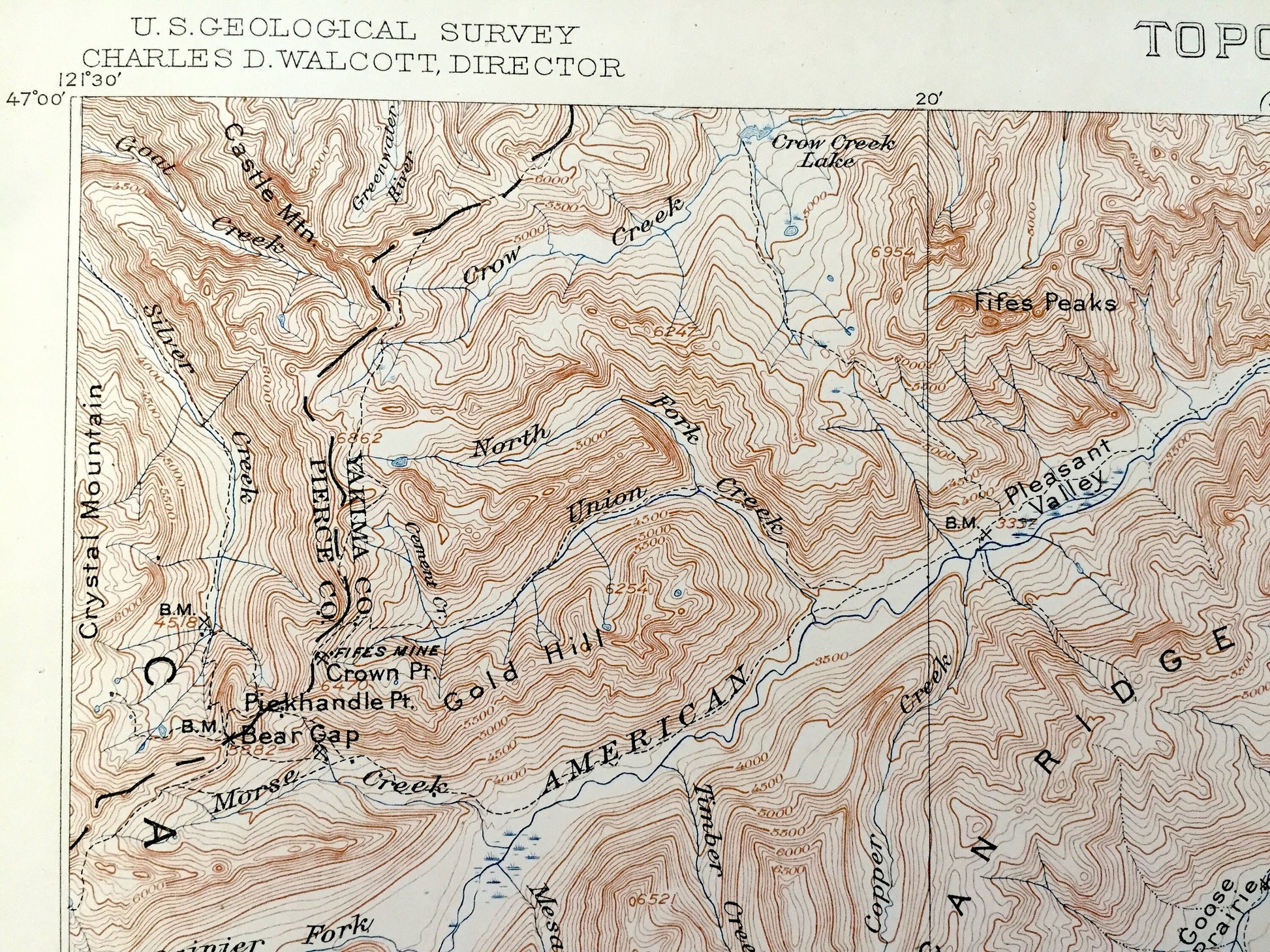 Points of Interest: Mount Aix, Mount Rainier Forest Reserve, Cascade Range, American Ridge, Naches River, Tieton Basin, Bumping River, Divide Ridge, Tieton River, American River, Twin Sister Lakes, Bethel Ridge, Goat Peak, Fifes Peaks, Bumping Lake, White Pass, Bootjack Rock, Devils Canyon, Gold Hill, Conrad Meadows, Darling Mountain, and lots more hills, mountains, creeks, towns, roads and train tracks.