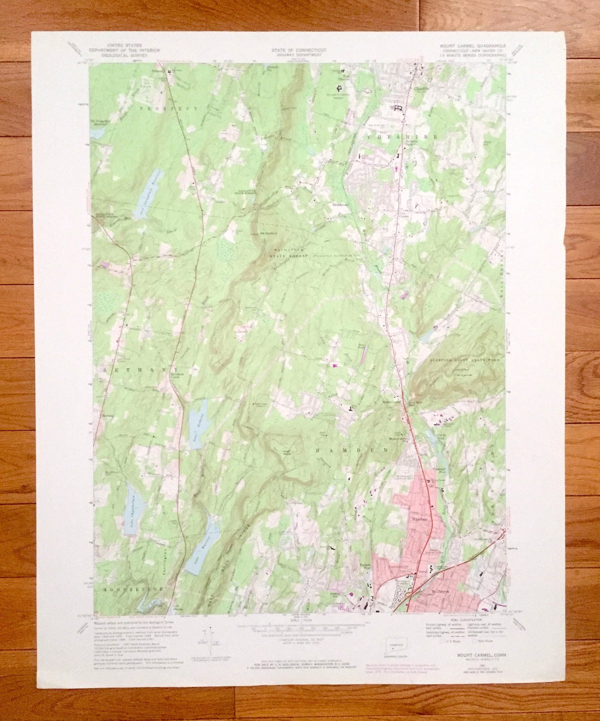 Beautiful, antique map of Mount Carmel, Connecticut and surrounding New Haven County area. This is an authentic 1967 edition, 1974 print from the U.S. Geological Survey and NOT a computer reproduction.