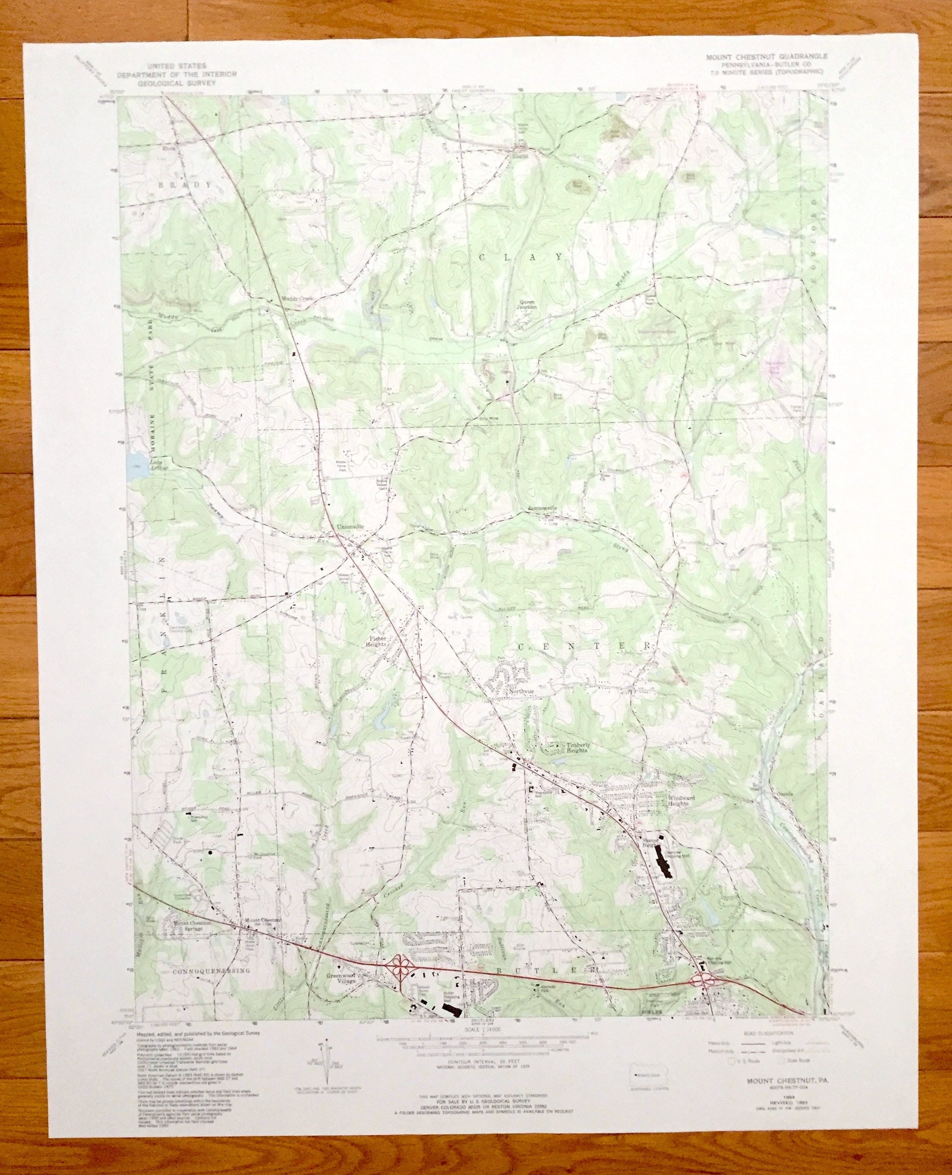 Beautiful, antique map of Mount Chestnut, Pennsylvania and surrounding Butler County area. This is an authentic 1964 edition, 1993 print from the U.S. Geological Survey and NOT a computer reproduction.
