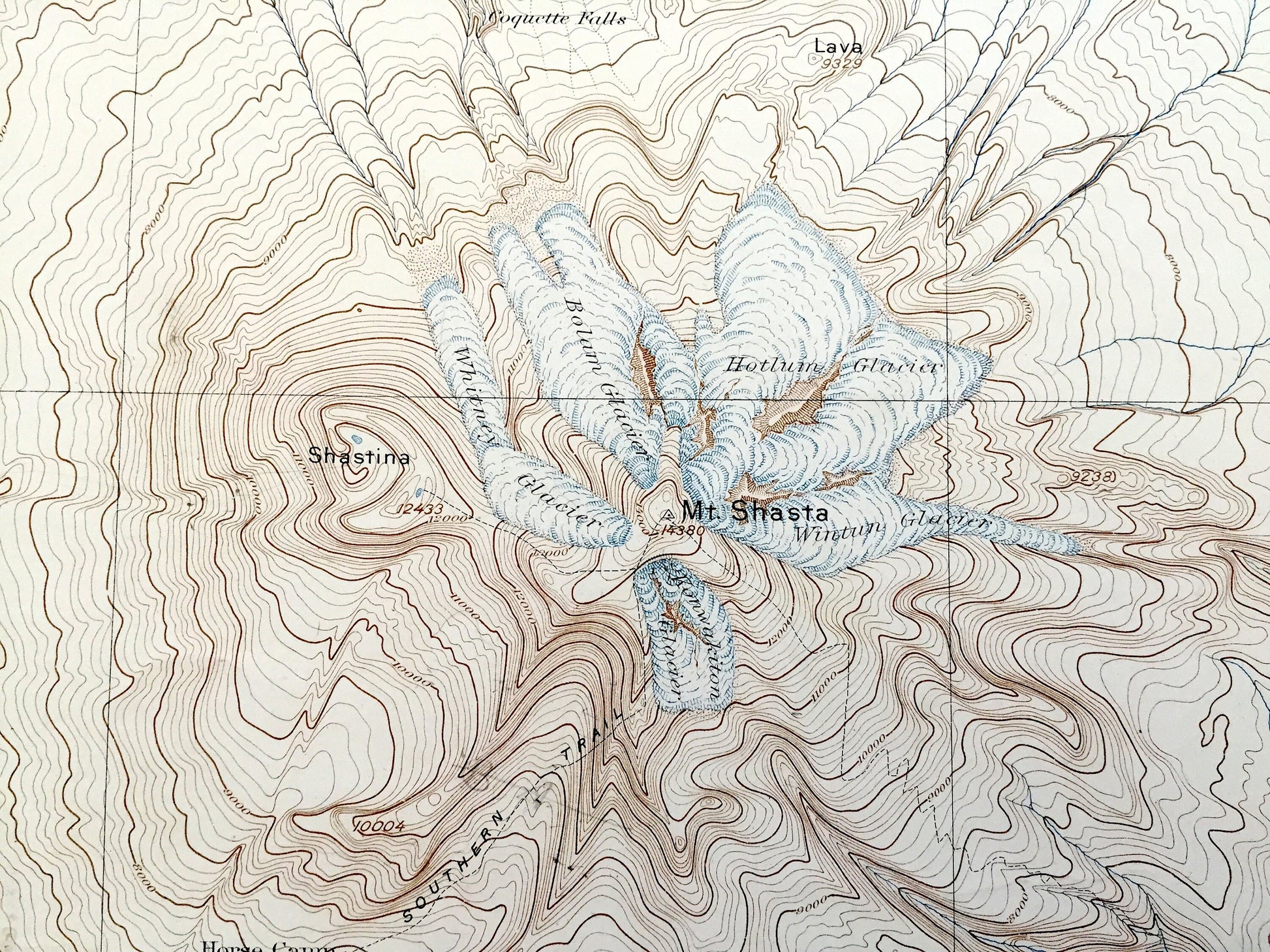Points of Interest: Mt. Shasta, Shastina, Siskayou County, Whitney Glacier, Bolam Glacier, Hotlum Glacier, Wintup Glacier, Konwakiton Glacier, Lava Flow, Lava Park, Cinder Cone, Inconstance Creek, The Gate, Red Butte, Gray Butte, Brewer Creek, Sisson Southern Trail, Panther Creek, Squaw Creek, Mud Creek, Southern Pacific Railroad, Big Spring Creek, Sacramento River, Bear Butte, and lots more, creeks, mountains, houses, roads and trails.