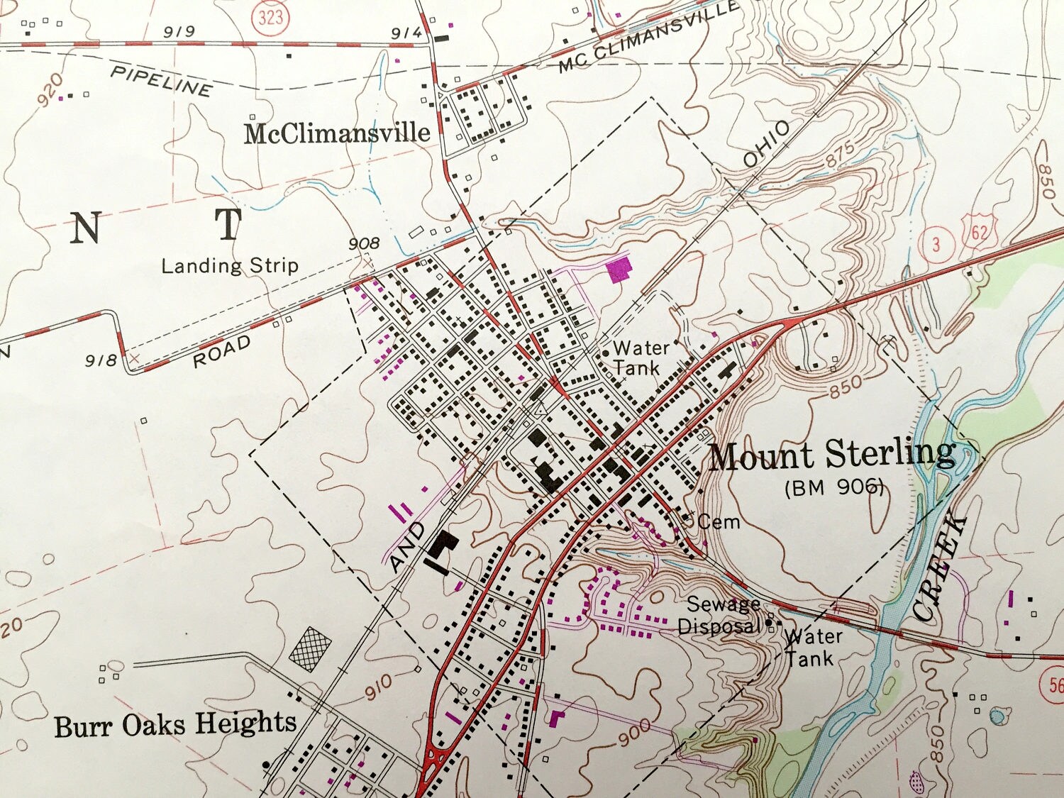 Beautiful, antique map of Mount Sterling, Pancoastburg, Madison Mills, Pleasant, Range, White Oak, and Yankeetown, Ohio. This is an authentic 1974 print of 1961 survey data from the U.S. Geological Survey and NOT a computer reproduction.