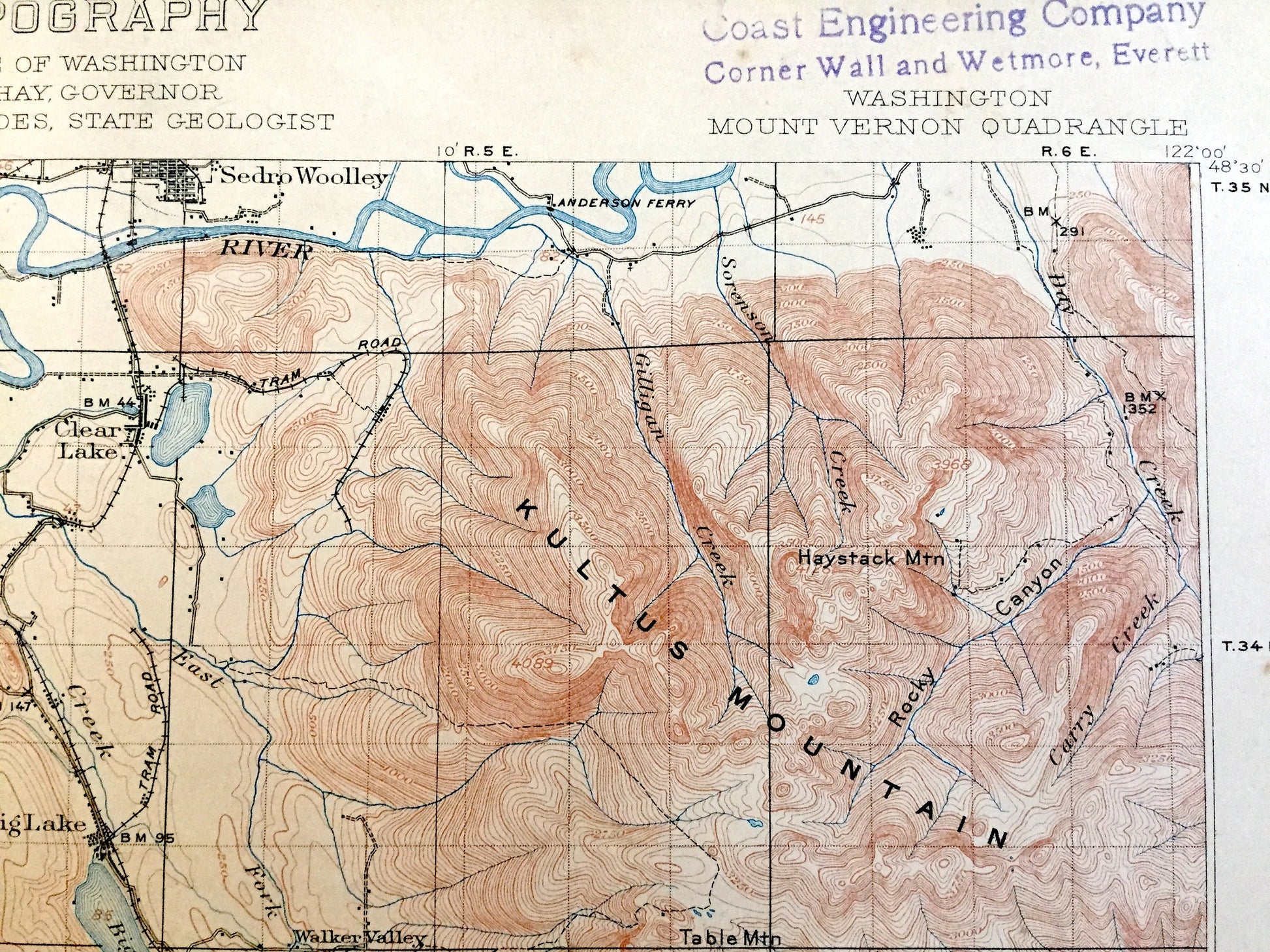 Points of Interest: Island County, Skagit County, Snohomish County, Tulalip Indian Reservation, Skagit Bay, Port Susan, Saratoga Passage, Possession Sound, Padilla Bay, Skagit River, Stillaguamish River, Snohomish River, Camano Island, Whidbey Island, Hat Island, Kultus Mountain, Frailey Mountain, Lake Goodyear, Lake Stevens, Big Lake, Cavanaugh Lake, and many more towns, bays, rivers, islands, train tracks, roads, hills, streams and rivers.