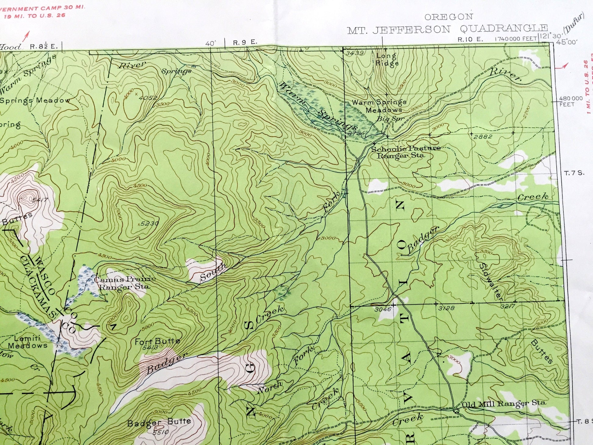 Beautiful, antique map of Mt Jefferson, Oregon and surrounding Marion, Linn, Jefferson, Wasco & Clackamas County area, including Mount Hood National Forest and Warm Springs Indian Reservation. This is an authentic 1927 edition, 1956 print from the U.S. Geological Survey and NOT a computer reproduction.