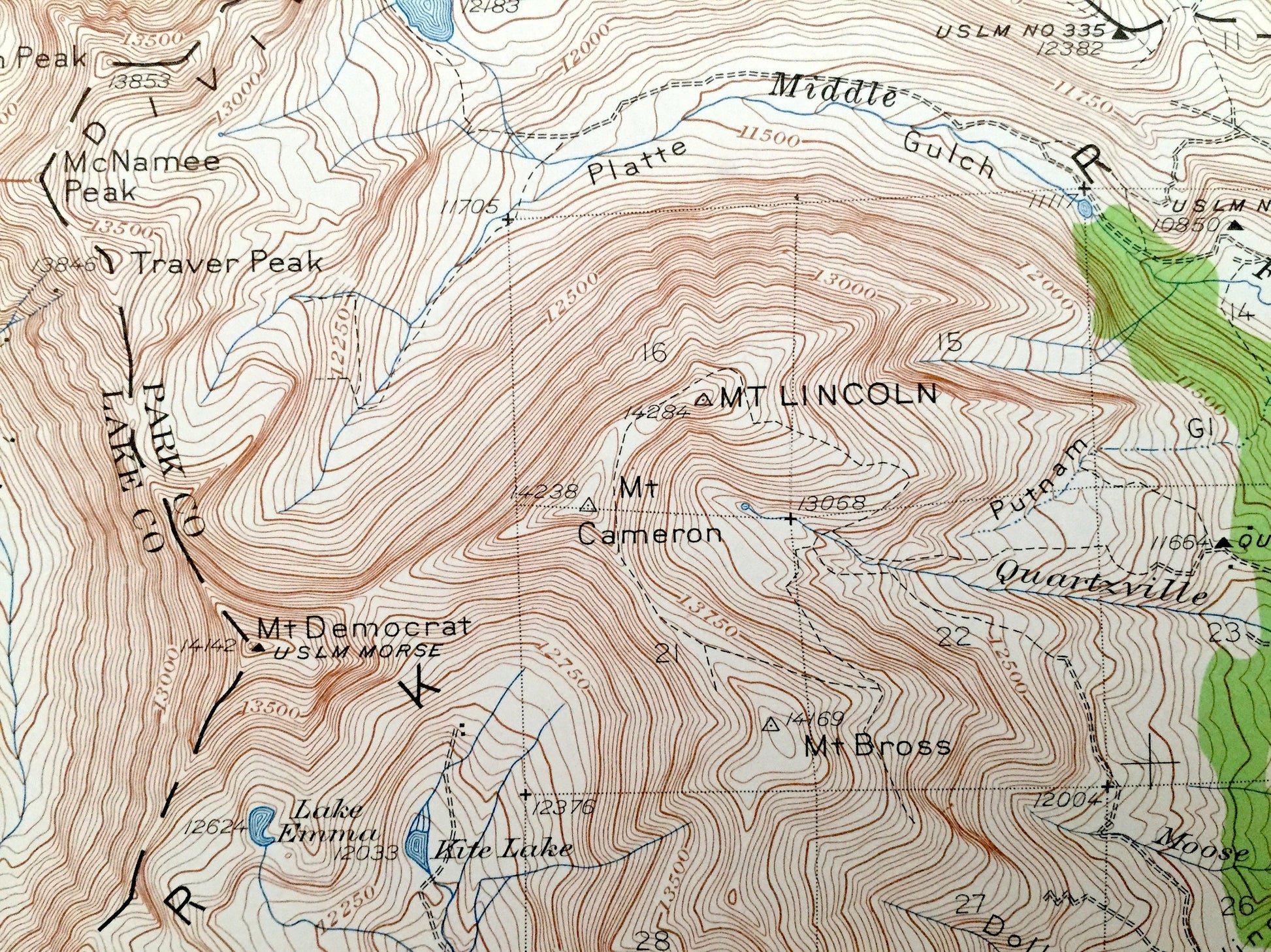 Points of Interest: Lake County, Summit County, White River National Forest, Arapaho National Forest, San Isabel National Forest, Pike National Forest, South Platte River, Tenmile Creek, Robinson Lake, Breckenridge Ski Area, Copper Mountain Ski Area, Mt Lincoln, Mt Democrat, Arkansas River, Tenmile Range, Mt. Argentine, Jacque Peak, Mohawk Lake, Quandary Peak, Blue River, and many more smaller lakes, creeks, mountains, valleys, houses, schools, roads, churches and train tracks.