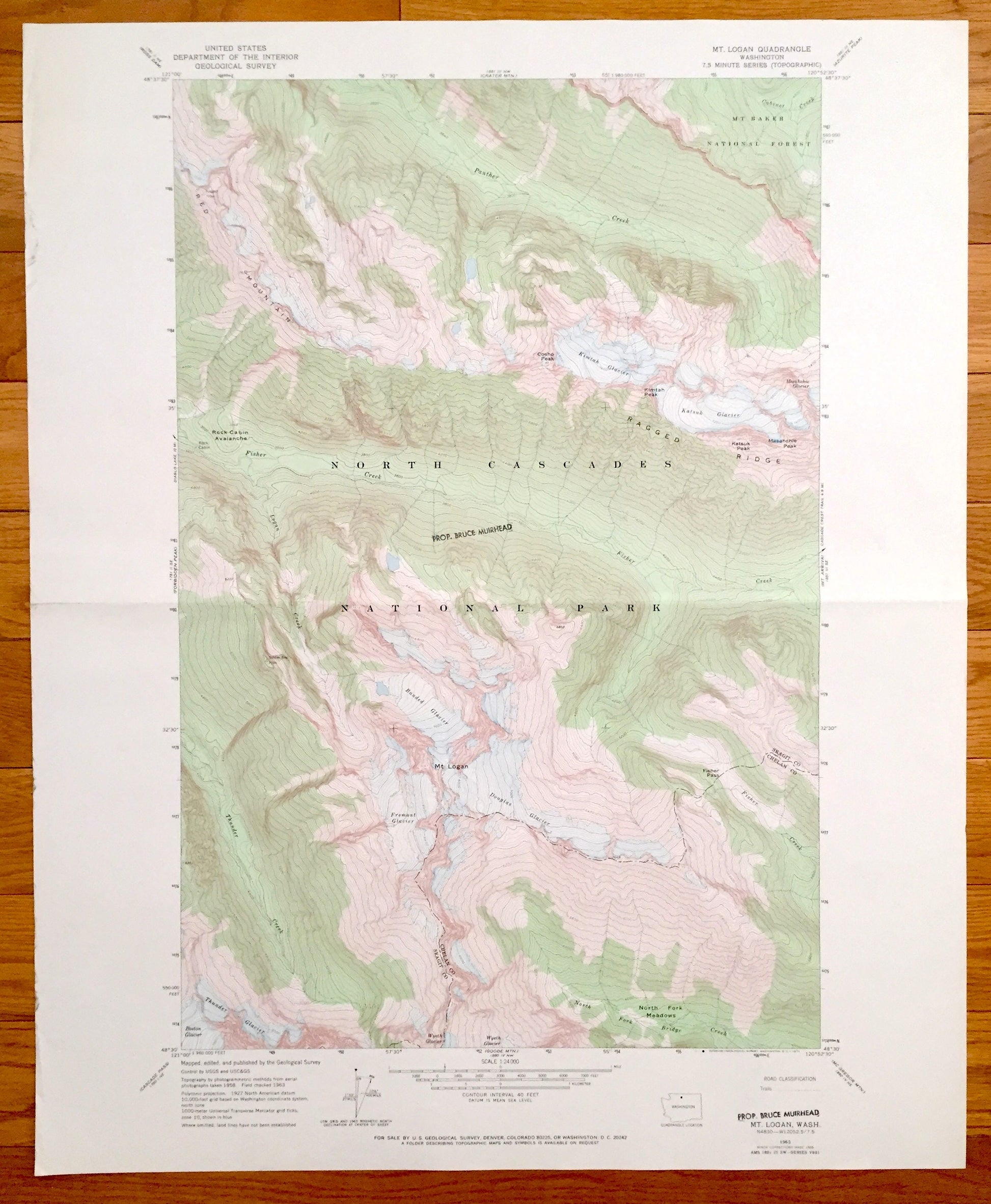 Beautiful, antique map of Mt. Logan, Washington and surrounding Chelan County and Skagit County areas including North Cascades National Park. This is an authentic 1963 edition, 1969 print from the U.S. Geological Survey and NOT a computer reproduction.