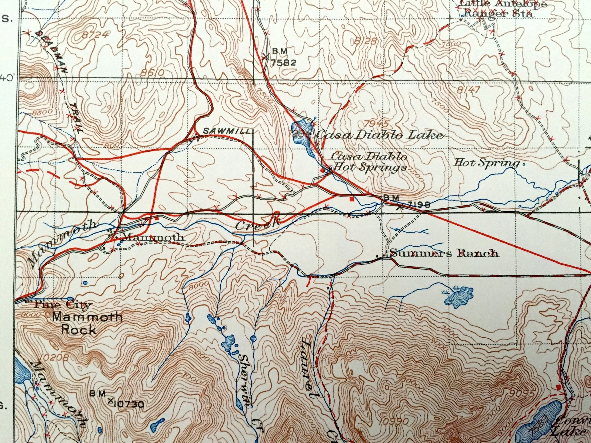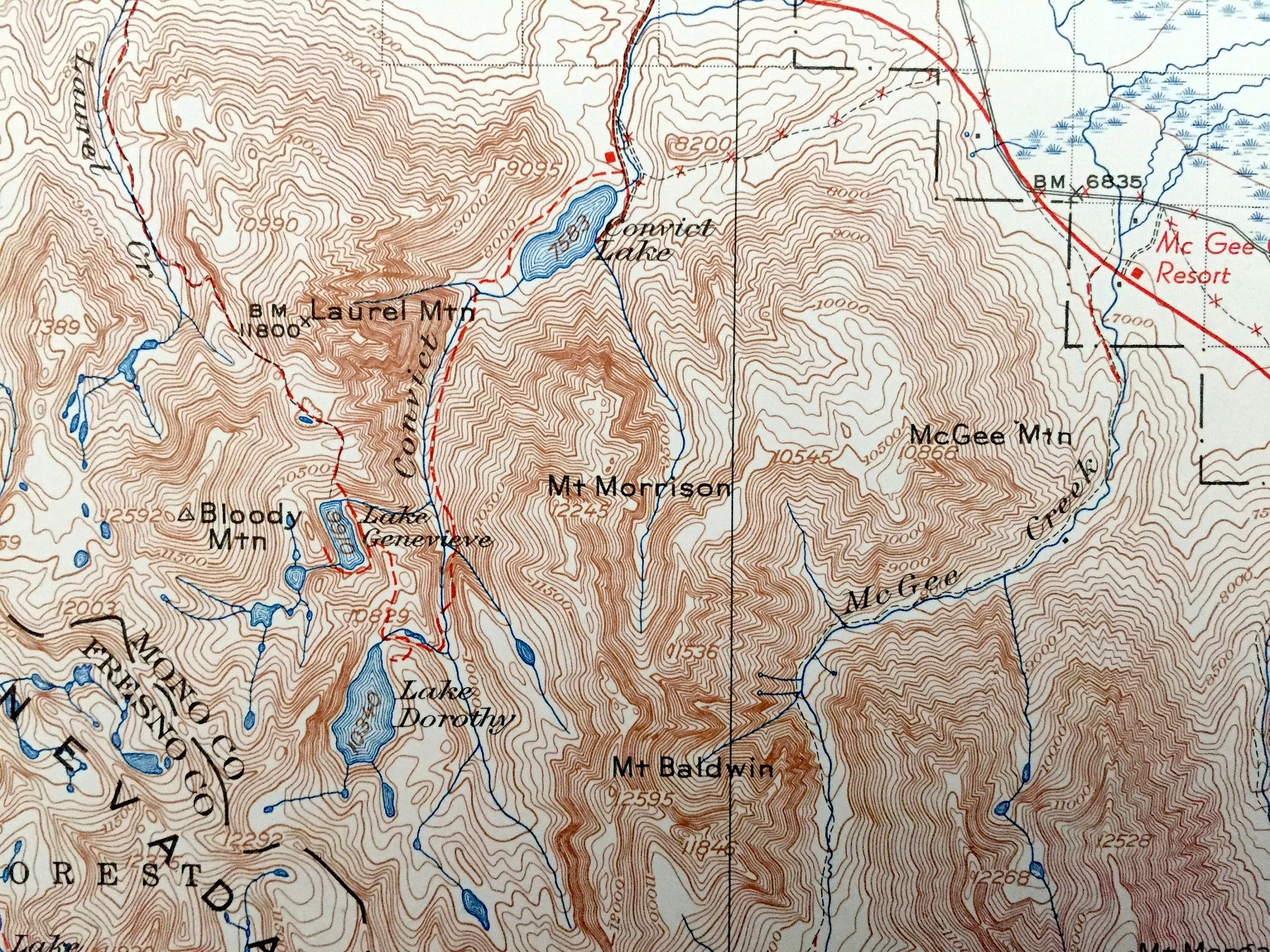 Points of Interest: Mono County, Fresno County, Inyo National Forest, Long Valley, Lake Crowley, Sierra Nevada, Sierra National Forest, Convict Lake, Lake Dorothy, Mammoth Crest, Nevahbe Ridge, Mt. Morgan, Lookout Mountain, Bloody Mountain, Little Antelope Valley, Mono Lake, Mono Basin, Adobe Valley, Benton Range, Volcanic Tableland, Sierra Nevada, Sierra National Forest, Glass Mountain, Blind Spring Valley, Casa Diablo Mountain, Little Round Valley, Owens River, Bald Mountain, Mt Morgan, Mt Baldwin, Laurel Mountain, McGee Mountain, Benton Crossing, Watterson Canyon, Wet Meadow, Granite Mountain, Mammoth Rock, Adobe Lake, River Spring Lakes and many more hills, mountains, canyons, creeks, houses, roads, ranches and camps.