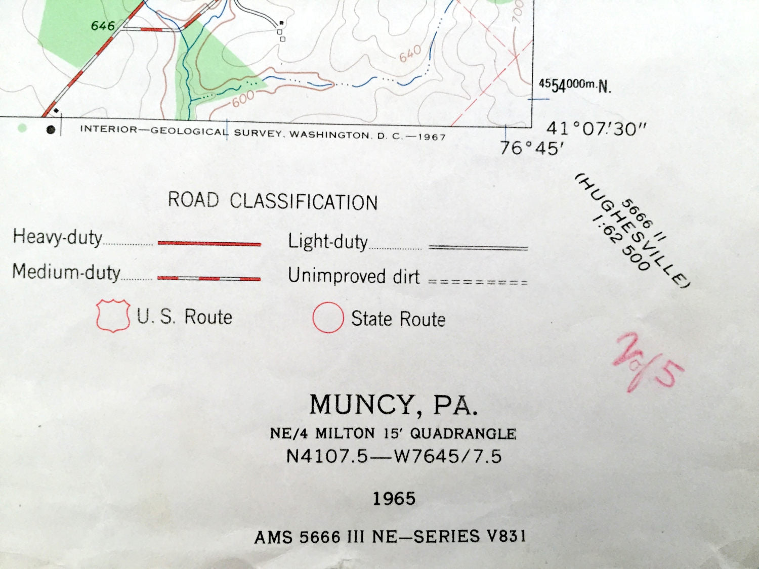 Points of Interest: Fairfield Golf Course, The Gut, Susquehanna River, Pennsylvania Railroad, Pilgrim Church, Muncy Reservoir, Muncy Creek, Drive-in Theatre, Muncy High School, Reading Rairlroad, Muncy Valley Hospital, and lots more hills, streams, ponds, churches, houses, and roads.