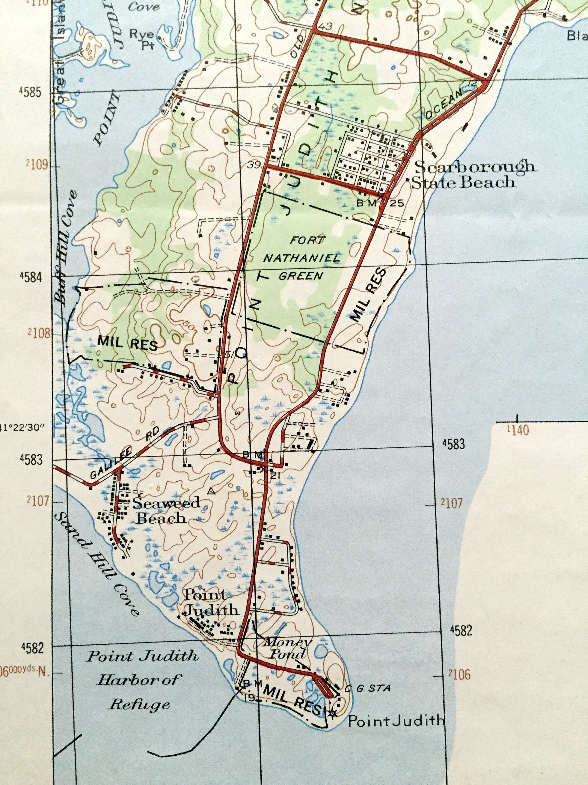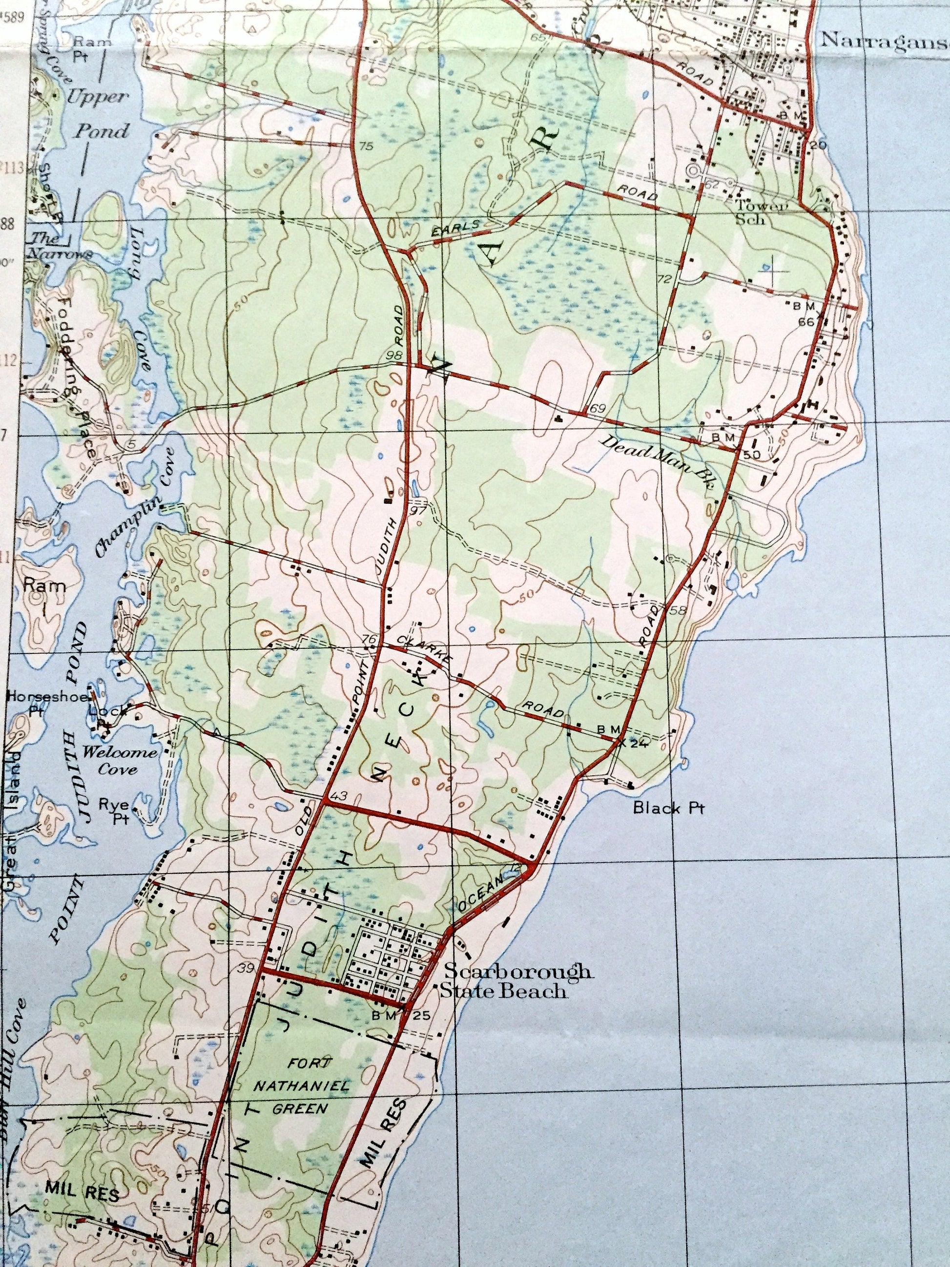 Points of Interest: Narragansett Bay, Rhode Island Sound, Atlantic Ocean, Washington County, Newport County, Indian Lake, Pettaquamscutt RIver, Point Judith Pond Beaver Neck, Conanicut Island, Dutch Island Harbor, Scarborough State Beach, Fishermans Memorial State Park, Point Judith, Sand Hill Cove, Point Judith Neck, US Naval Reservation, and many more hills, streams, ponds, houses, schools, churches and roads.