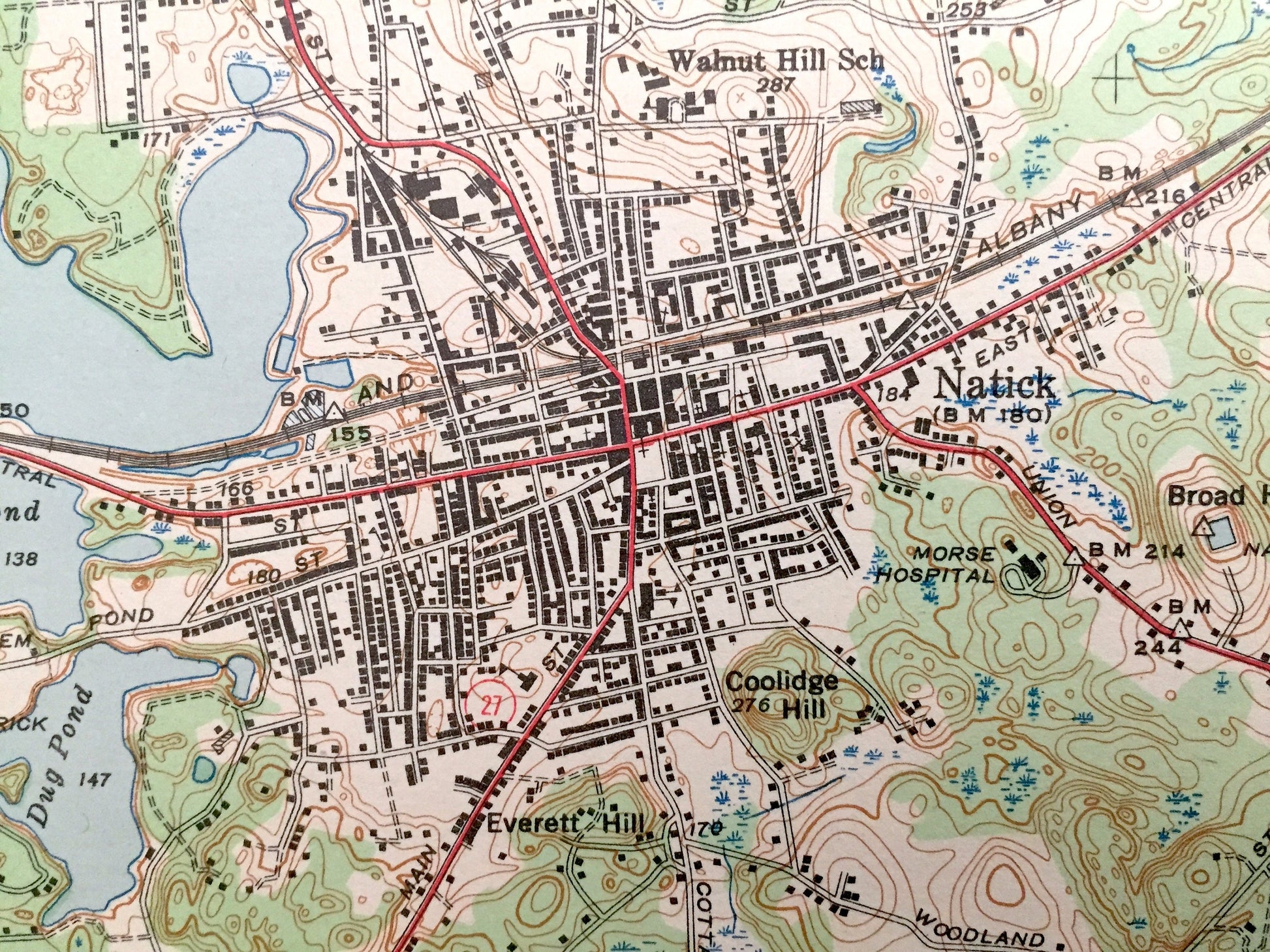 Beautiful, antique map of Natick, East Natick, Wellesley, and Needham, Massachusetts. This is an authentic edition of 1943 print from the U.S. Geological Survey and NOT a computer reproduction.