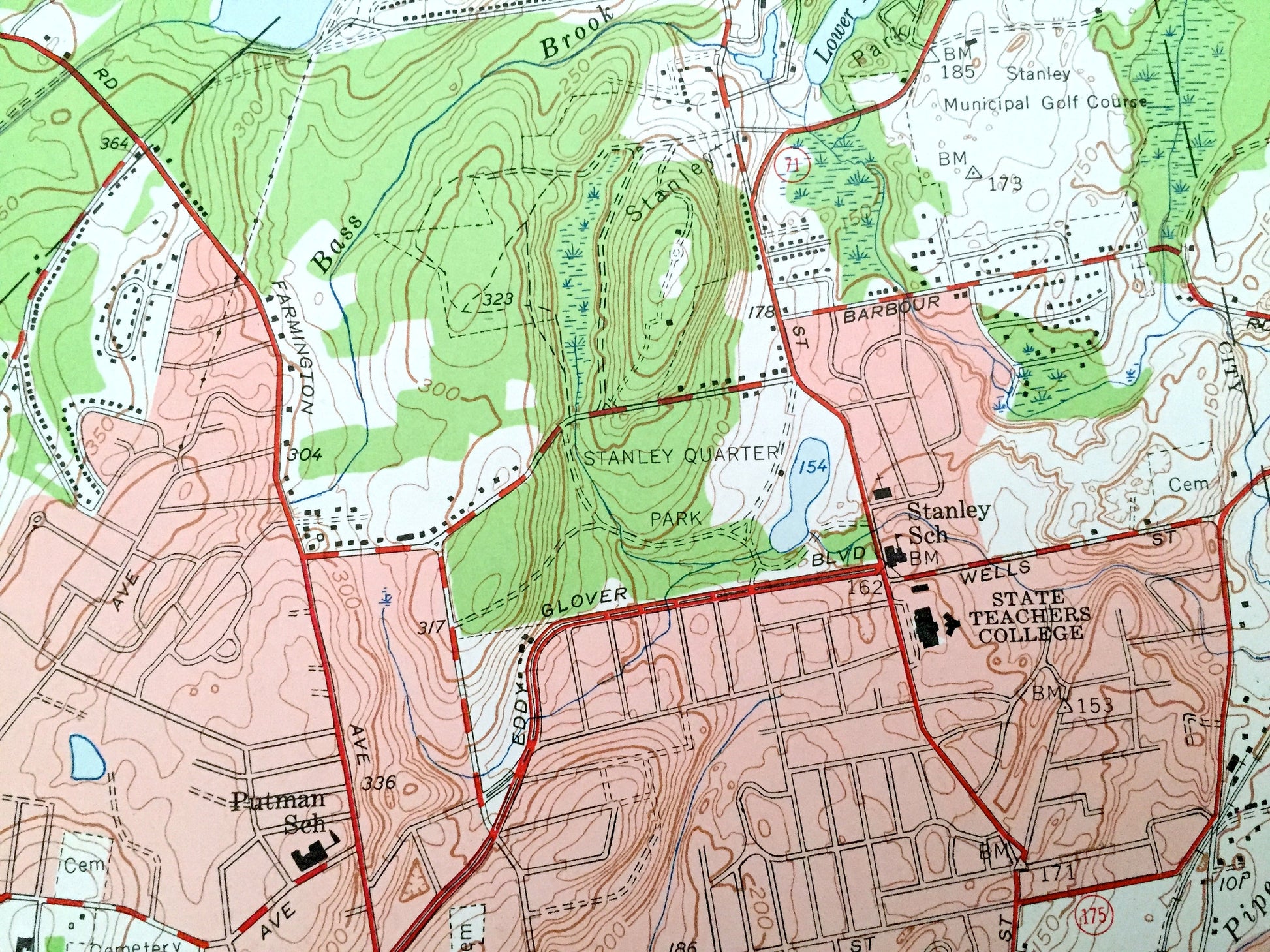 Points of Interest: State Teachers College, Sunset Rock State Park, Holy Family Monastery, Stanley Municipal Golf Course, Stanley Quarter Park, Plainville Stadium, Advent Christian Camp, Rattlesnake Mountain, Farmington Mountain, Talcott Mountain, Bradley Mountain, Churchill Hill, Osgood HIll, Pinnacle Rock, Cooks Gap, Farmington River, Pequabuck River, Plainville Reservoir, Shuttle Meadow Reservoir, Doerr Pond, Mattabesset River, Batterson Park Pond, Wood Pond, Farmington Reservoir, Swamp Brook, Patton Brook, Quinnipiac Trout, Poplar Swamp, Shade Swamp, Dead Wood Swamp, and many more hills, streams, ponds, houses, schools, railroads, churches and roads.