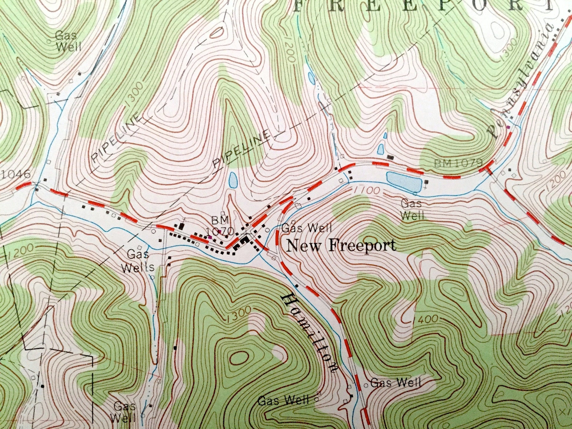 Beautiful, antique map of New Freeport, Pennsylvania and surrounding Greene County areas. This is an authentic 1964 edition, 1973 print from the U.S. Geological Survey and NOT a computer reproduction.