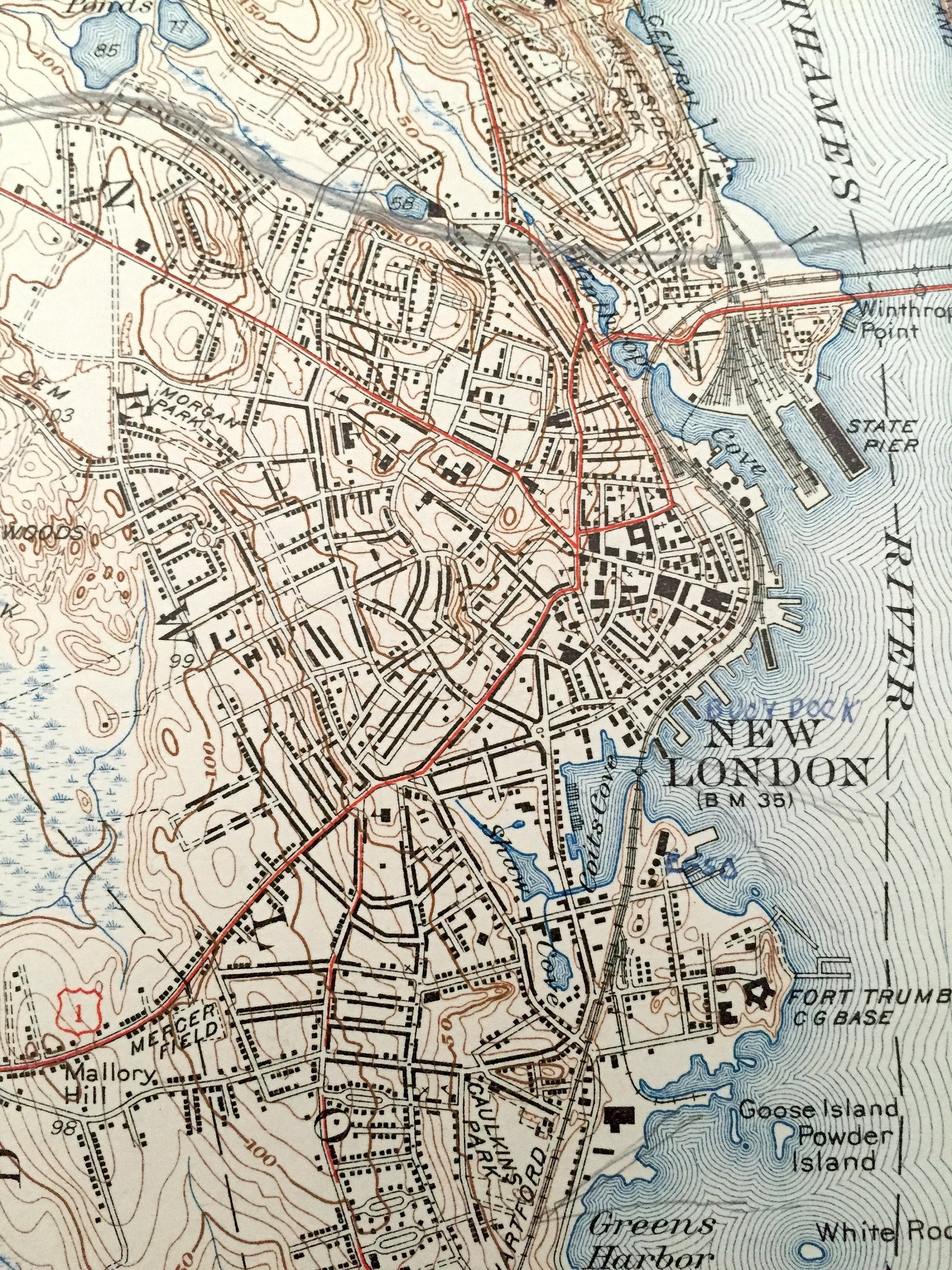 Beautiful, antique map of historic New London, Connecticut and surrounding area on the Connecticut Shoreline, including Fisher Island of New York. This is an authentic 1938 print from the U.S. Geological Survey and NOT a computer reproduction.
