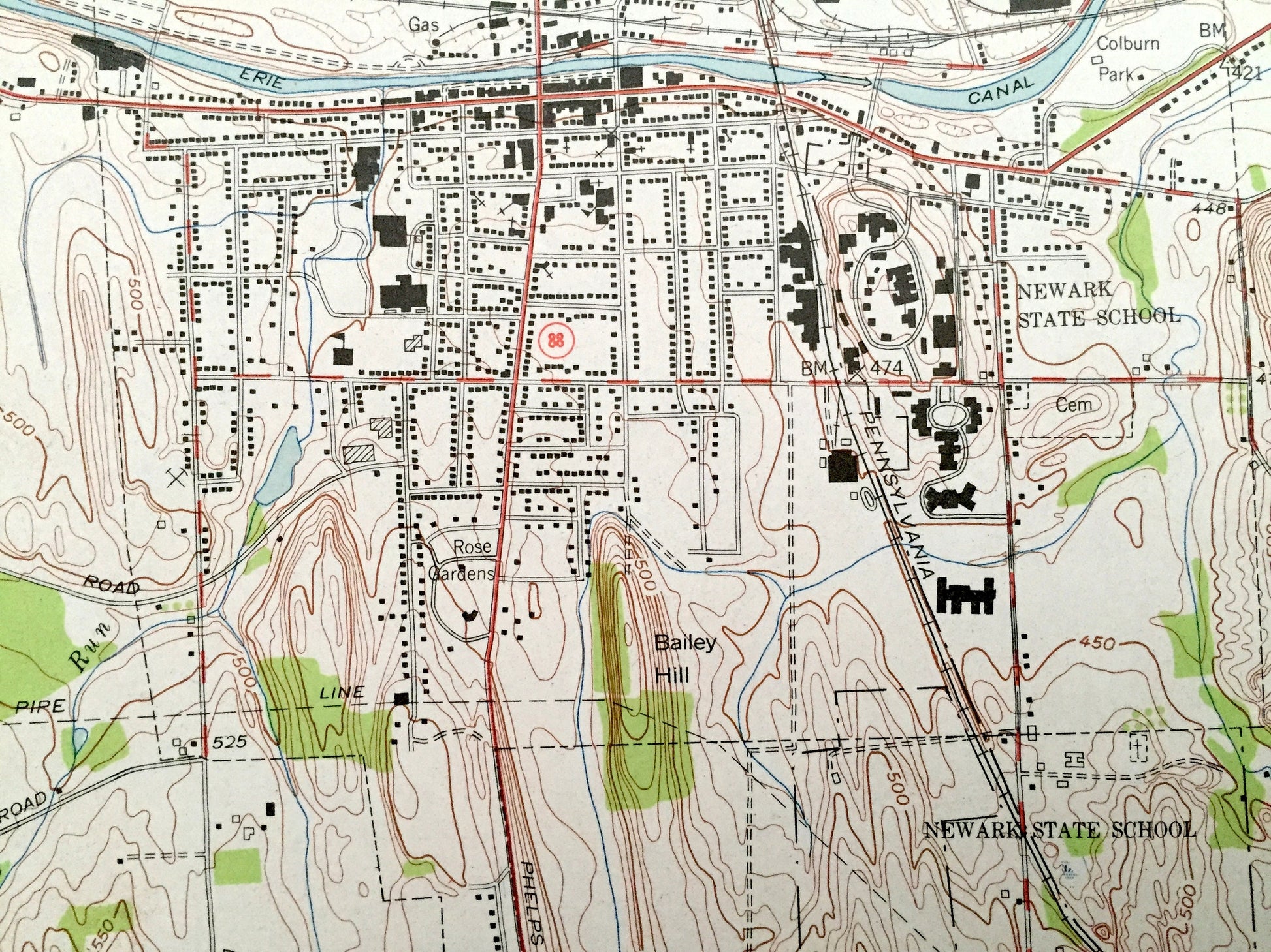 Points of Interest: Newark State School, Colburn Park, Newark County Club, Bailey Hill, Silver Hill, Jackson Hill, Ganargua Creek, Erie Canal, Sheers Pond, Butternut Run, Military Run, Canandaigua Outlet, and many more hills, streams, ponds, houses, schools, railroads, churches and roads.
