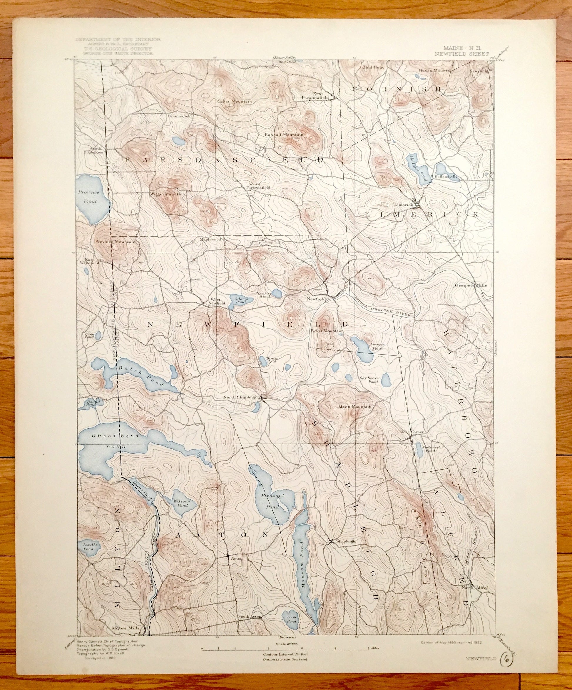 Beautiful, antique map of Newfield, Parsonsfield, Limerick, Shapleigh, Alfred, Waterboro, Acton, Maine, including surrounding Millton and East Wakefield, New Hampshire. This is an authentic 1893 edition, 1922 print from the U.S. Geological Survey and NOT a computer reproduction.