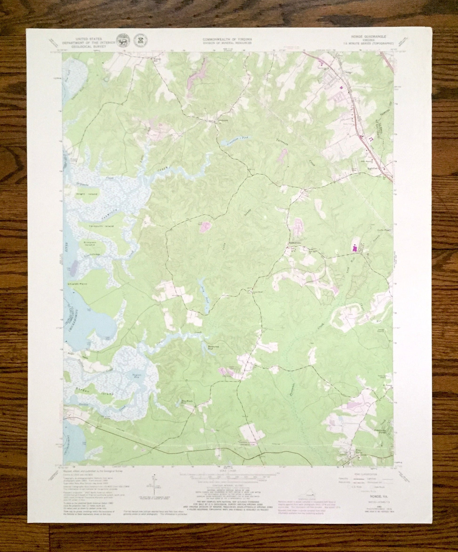 Beautiful, antique map of Norge, Virginia and surrounding James City County area. This is an authentic 1965 edition, 1980 print from the U.S. Geological Survey and NOT a computer reproduction.