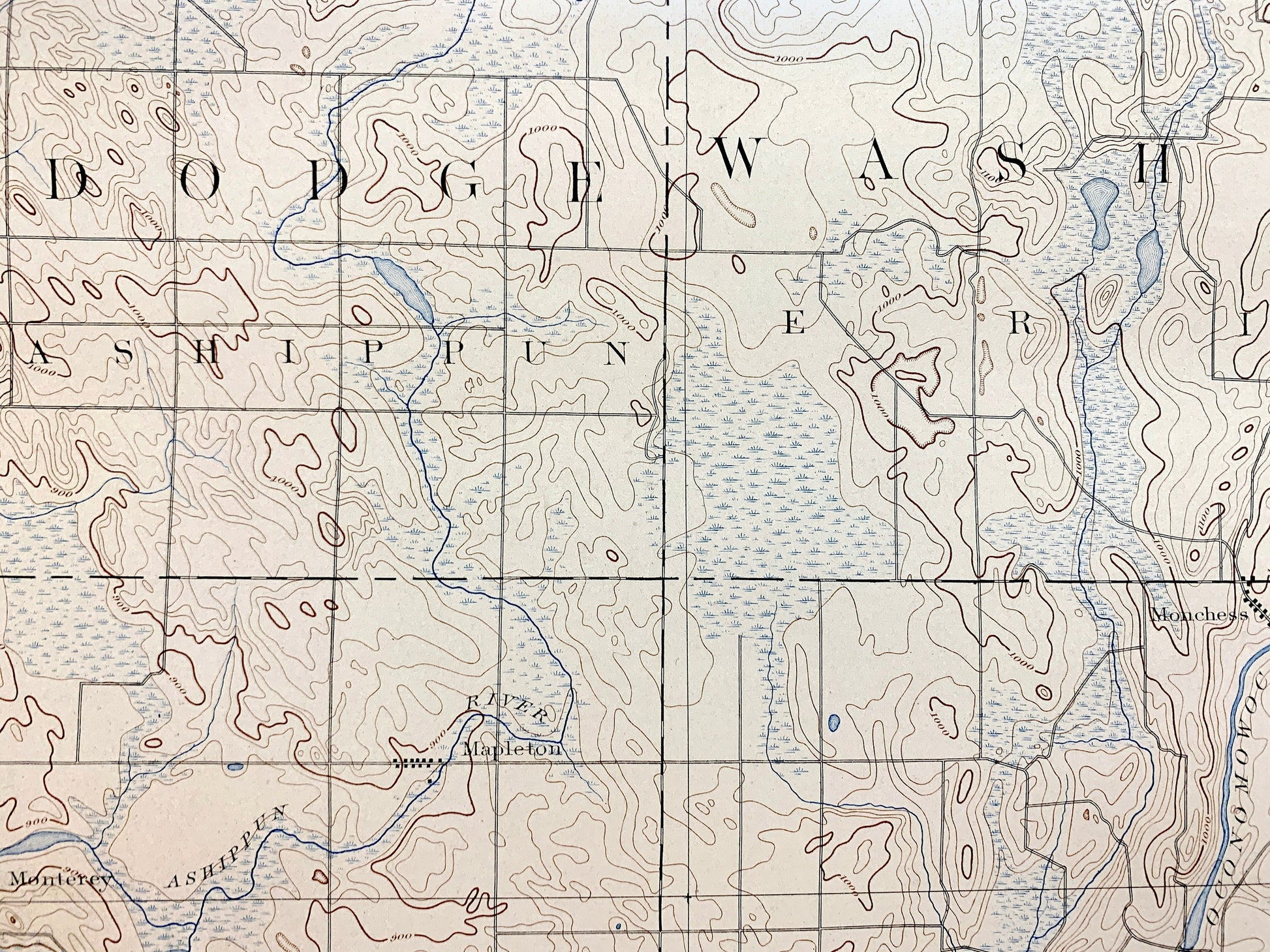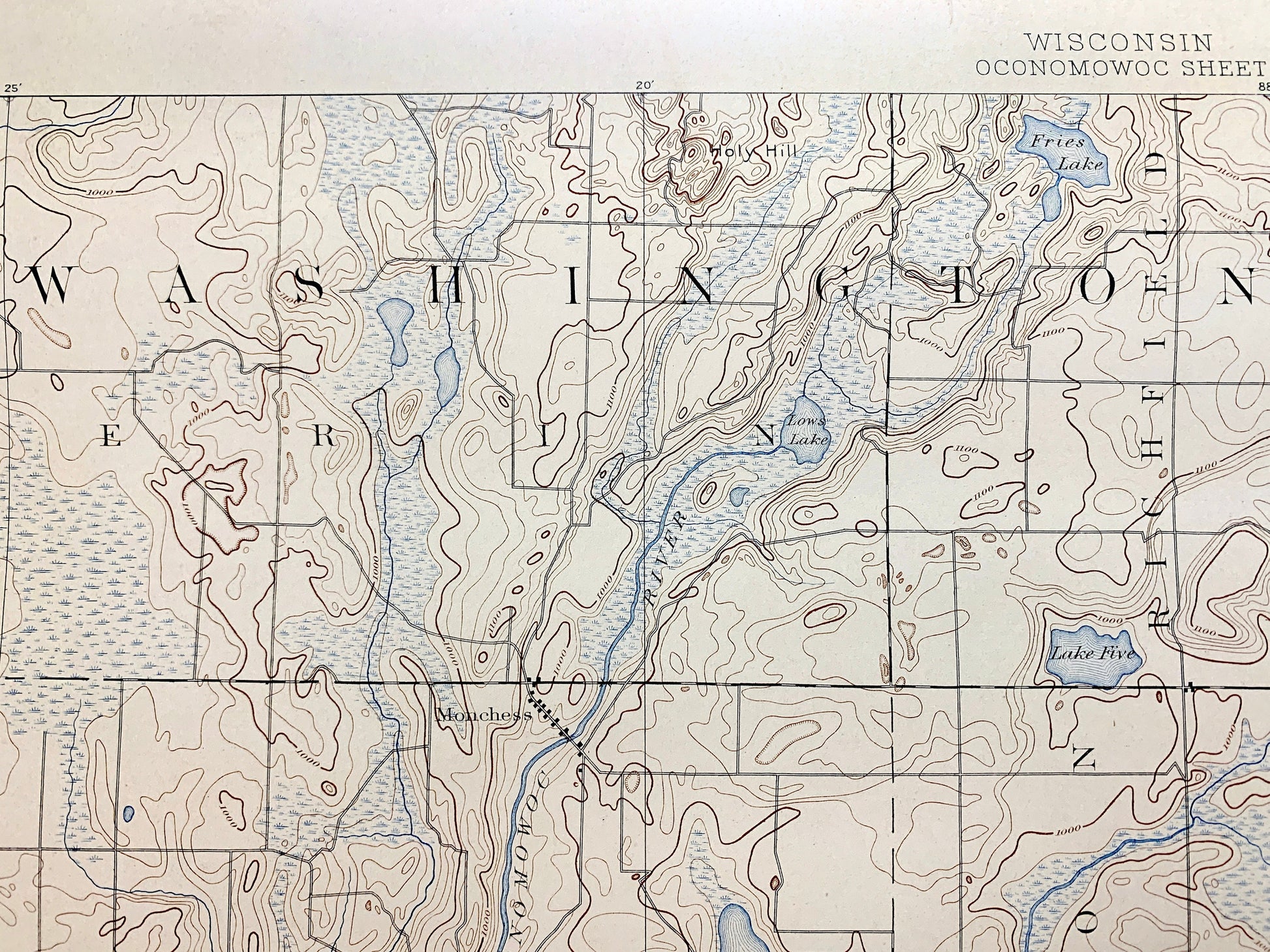 Beautiful, antique map of Oconomowoc, Wisconsin and surrounding Waukesha, Washington and Dodge County areas. This is an authentic 1892 print from the U.S. Geological Survey and NOT a computer reproduction.