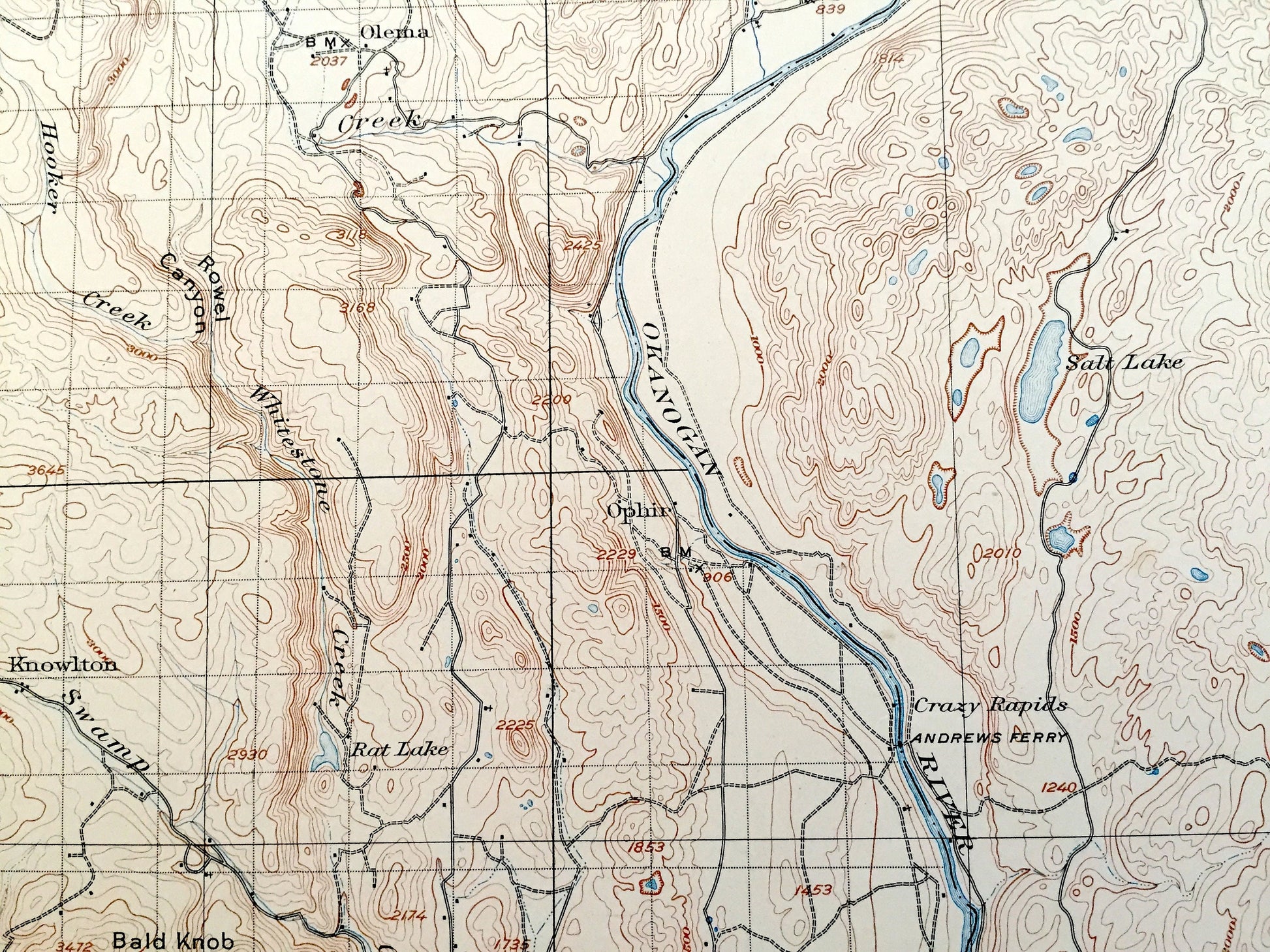 Antique Okanogan, Washington 1905 US Geological Survey Topographic Map – Okanogan County, Alma, Olema, Malott, Knowlton, Pateros, Bridgeport