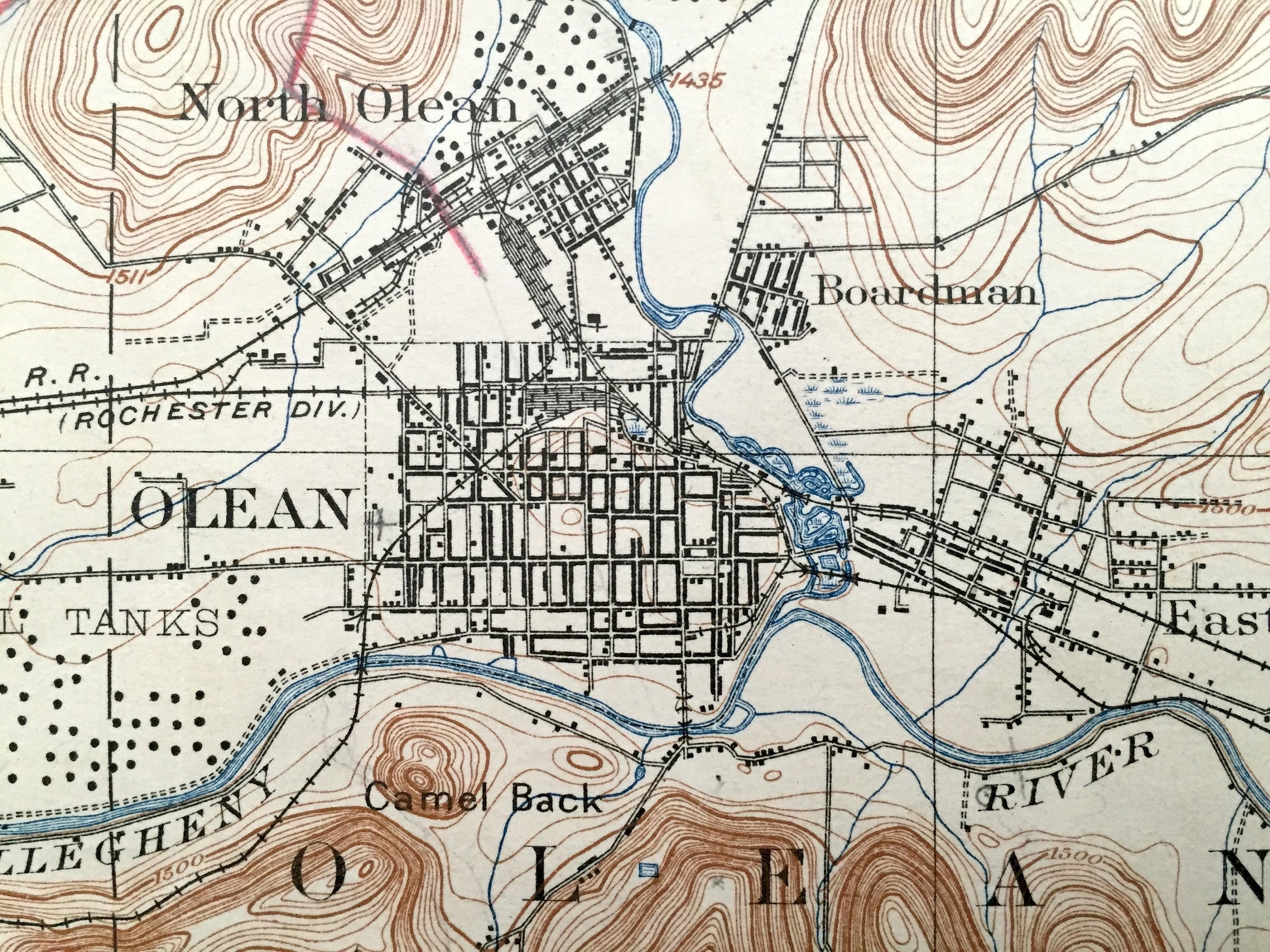 Beautiful, antique map of Olean, New York and surrounding Cattaraugus & Allegheny County areas. This is an authentic 1898 edition, 1932 print from the U.S. Geological Survey and NOT a computer reproduction.