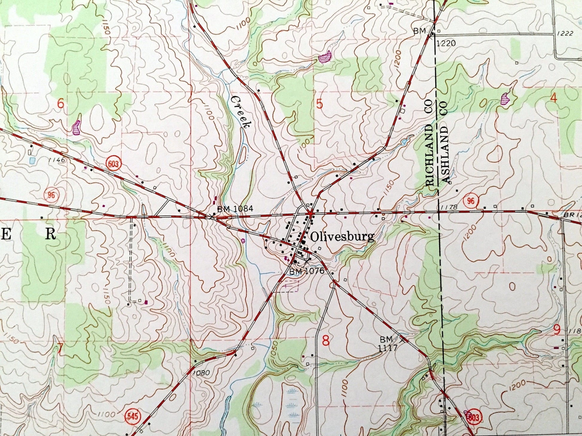 Beautiful, antique map of Olivesburg, Ohio and surrounding Richland County area. This is an authentic 1960 edition, 1990 print from the U.S. Geological Survey and NOT a computer reproduction.