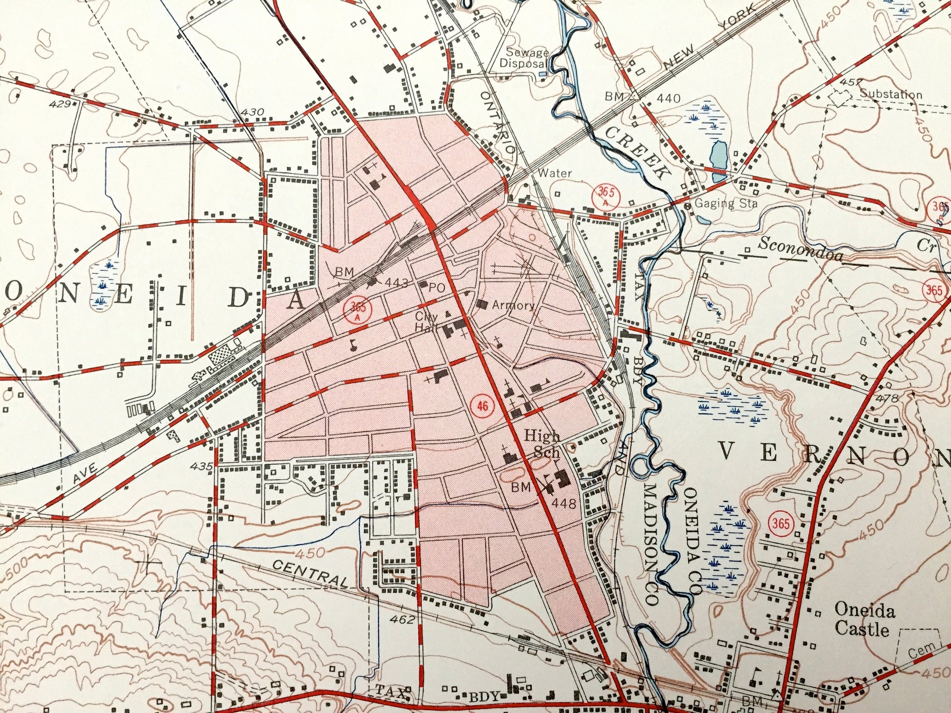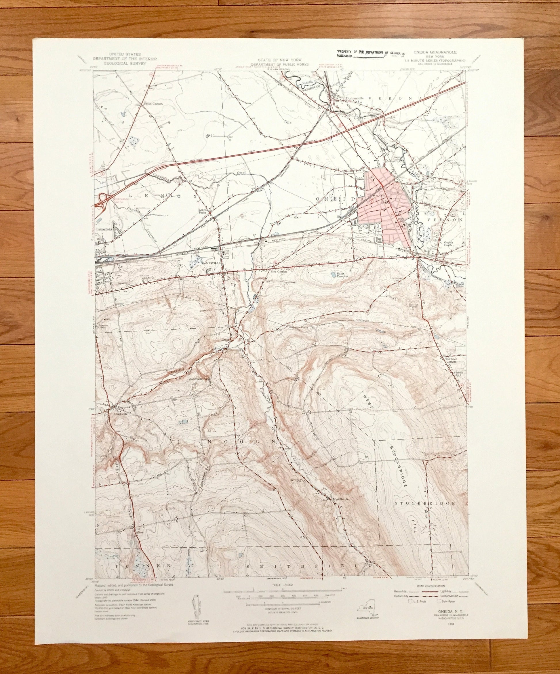 Beautiful, antique map of the Oneida, New York and surrounding Madison & Oneida County areas. This is an authentic 1955 edition, 1957 print from the U.S. Geological Survey and NOT a computer reproduction.