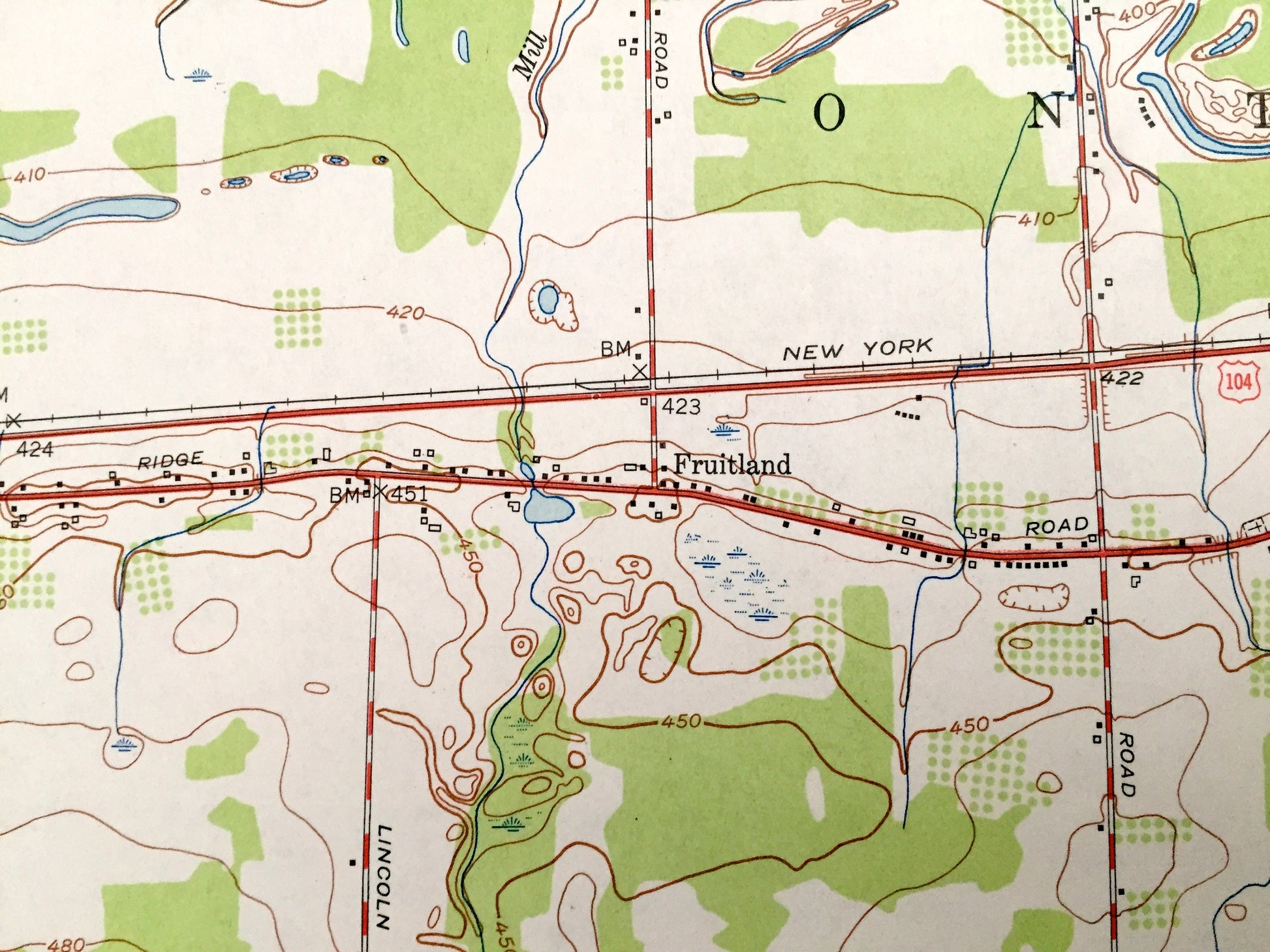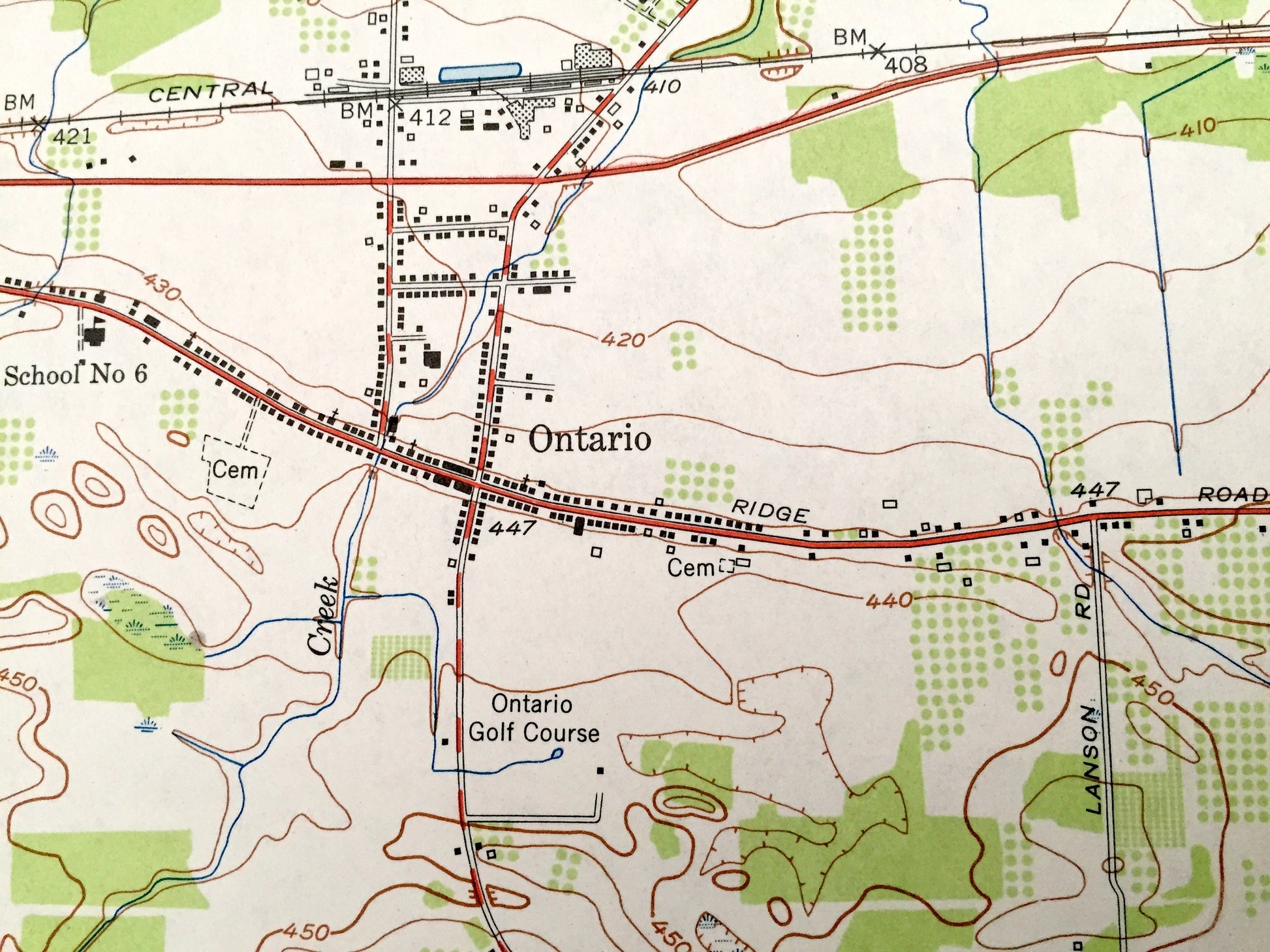 Points of Interest: Ontario Golf Course, Wayne Central School, Negro Hill, Trummonds Hill, Jacobs Hill, Mathewson Hill, Finley Hill, Morse Hill, Kuttruff Hill, Boyton Hill, Dennison Creek, Mill Creek, Bear Creek, Fourmile Creek, Black Creek, Red Creek, and many more hills, streams, ponds, houses, schools, railroads, churches and roads.