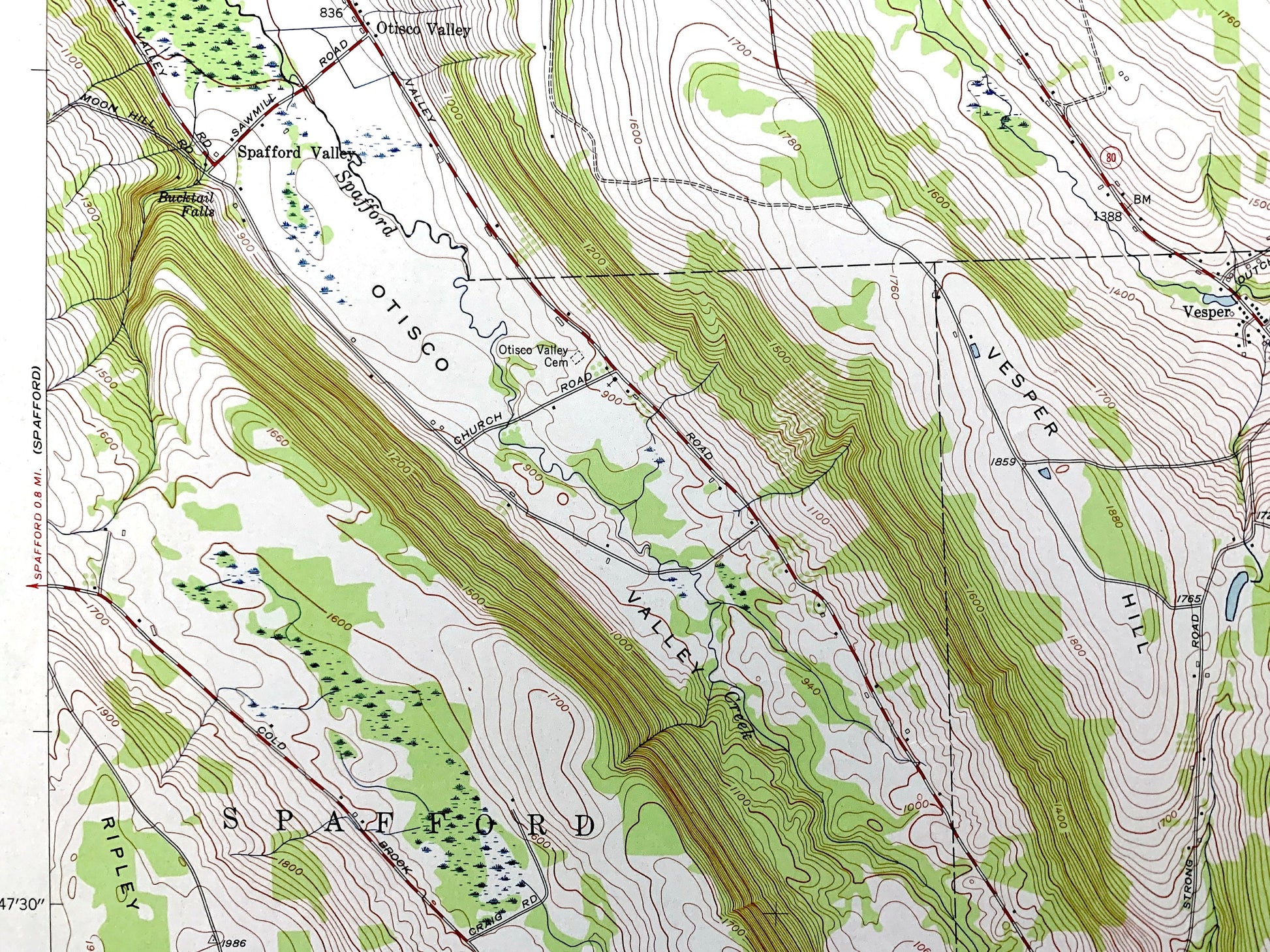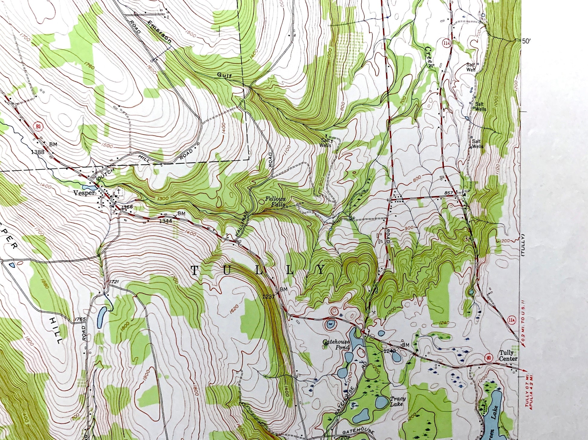 Points of Interest: Onondaga County, Cortland County, Otisco Valley, Tully Valley, Dutch Hill, Gifford Hill, Preble Hill, Vesper Hill, Bare Mountain, Tully Lake, Crooked Lake, Song Lake, Bennett Hollow, Rattlesnake Gulf, and many more lakes, ponds, islands, coves, hills, mountains, houses, train tracks, roads.