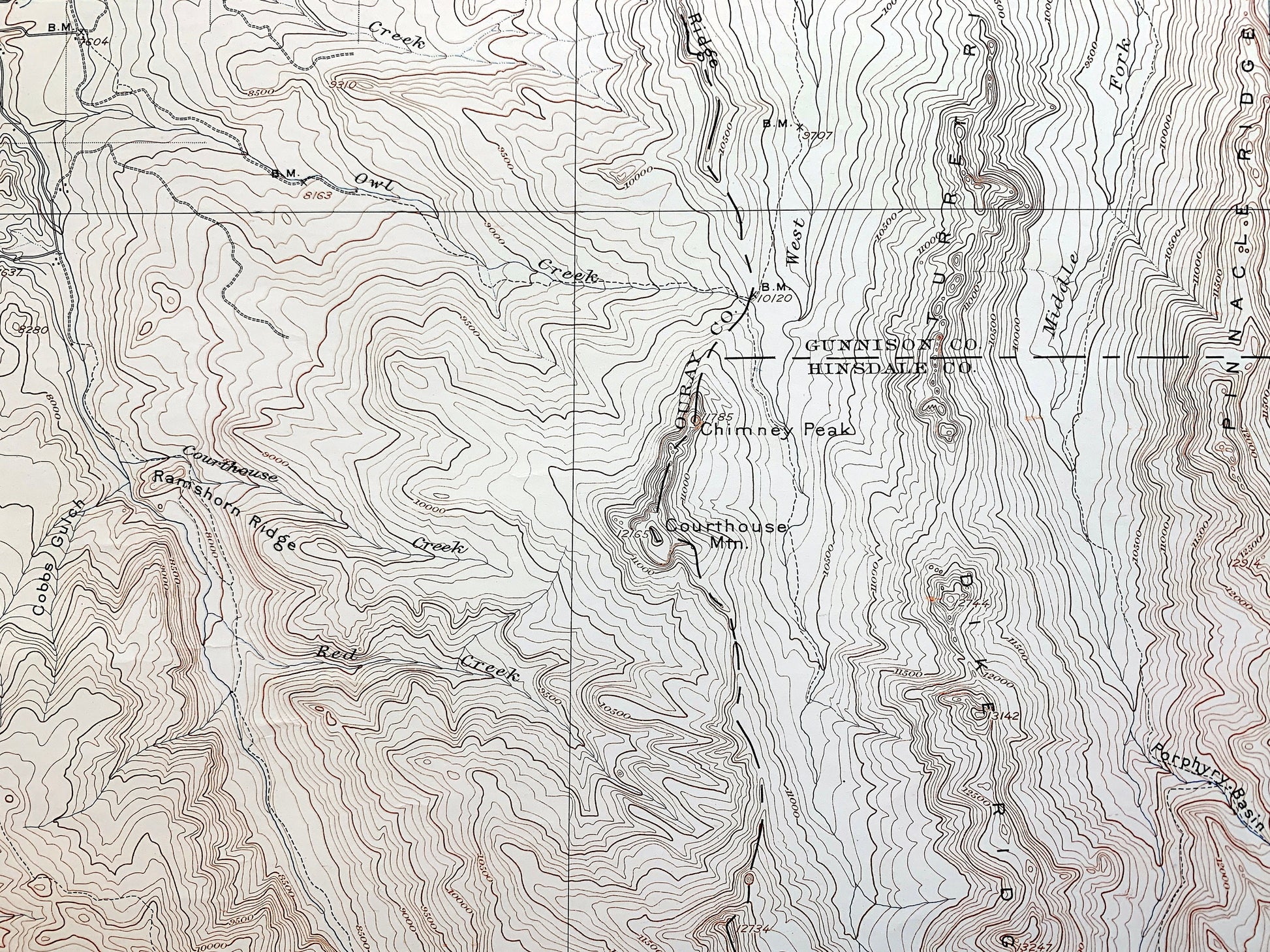 Points of Interest: Ouray County, Gunnison County, Hinsdale County, Uncompahgre River, Cow Creek, Cimarron Creek, Uncompahgre National Forest, Turret Ridge, Park Mesa, Pinnacle Ridge, Dike Ridge, Blackwall Mountain, Cimarron Ridge, Chimney Peak, Courthouse Mountain, Wetterhorn Peak, Cascade Mountain, Wildhorse Peak, American Flat, Baldy Peak, Horsethief Trail and many more smaller lakes, creeks, houses, schools, roads, churches and train tracks.