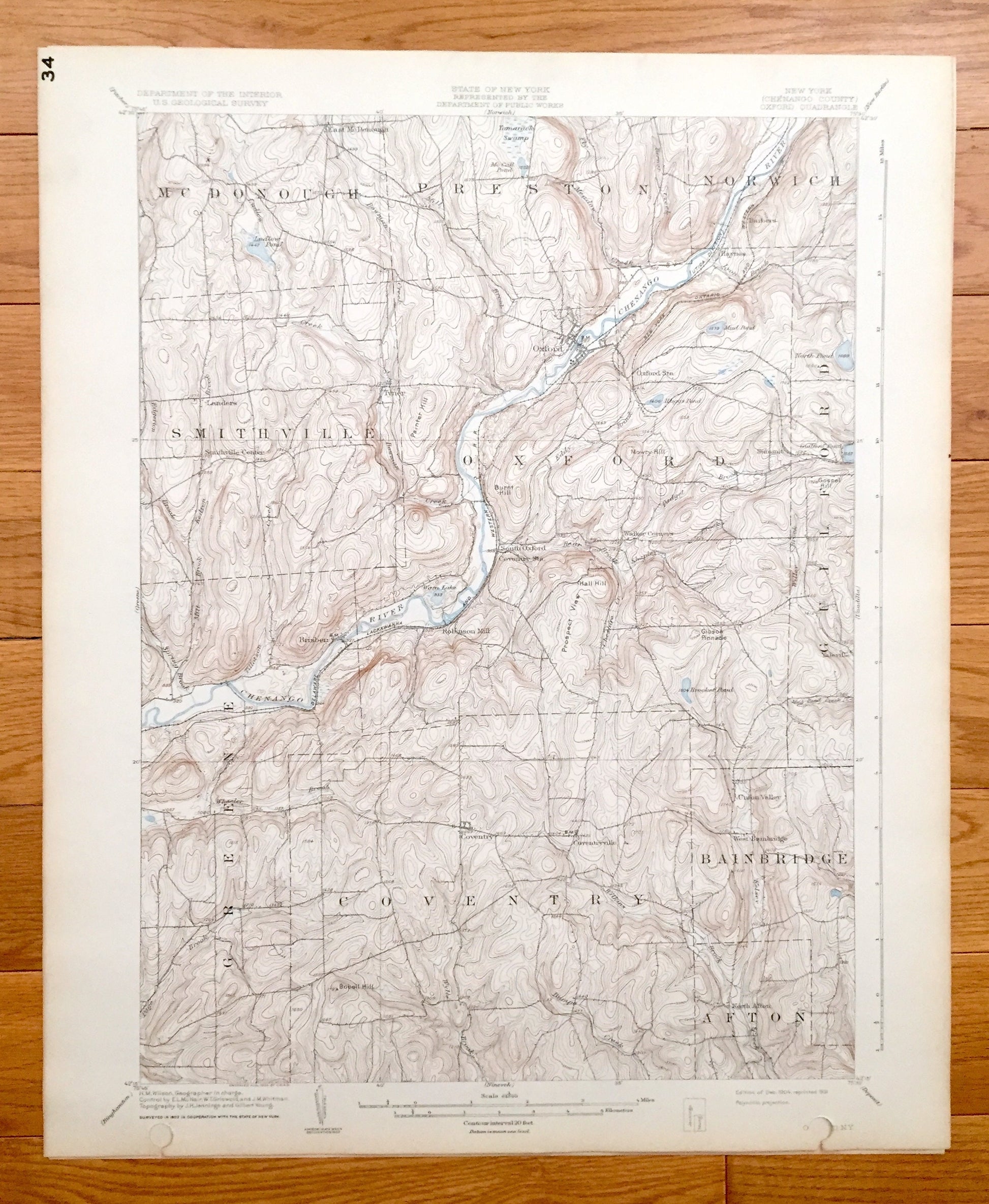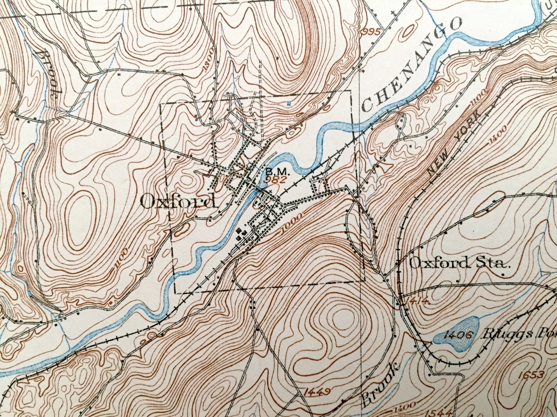 Beautiful, antique map of Oxford, New York and surrounding Chenango County areas. This is an authentic 1904 edition, 1931 print from the U.S. Geological Survey and NOT a computer reproduction.