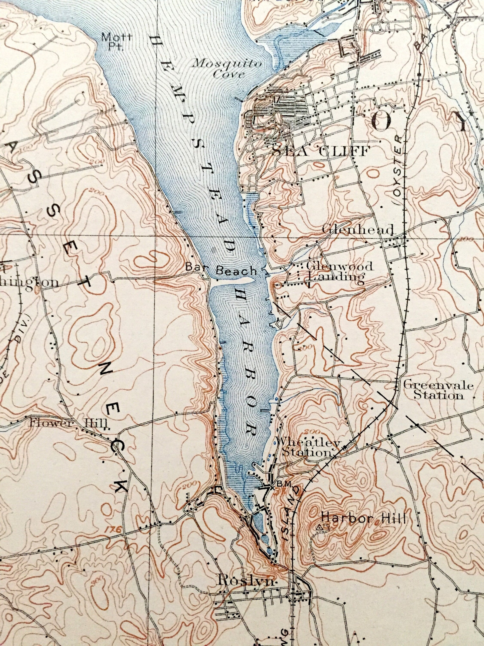 Points of Interest: Long Island Sound, Manhasset Bay, Hempstead Harbor, Oyster Bay Harbor, Nassau County, Westchester County, Queens Borough, Great Neck, Manhasset Neck, Scotch Caps, Oakland Beach, Manursing Island, Captain Harbor, Fairfield County, Barker Point, Matinicock Point, Dosoris Island, Centre Island, Rocky Point, Mosquito Cove, Bar Beach, Lake Surprise, Mill Neck Creek, Long Island Railroad, and lots more creeks, train tracks and roads.