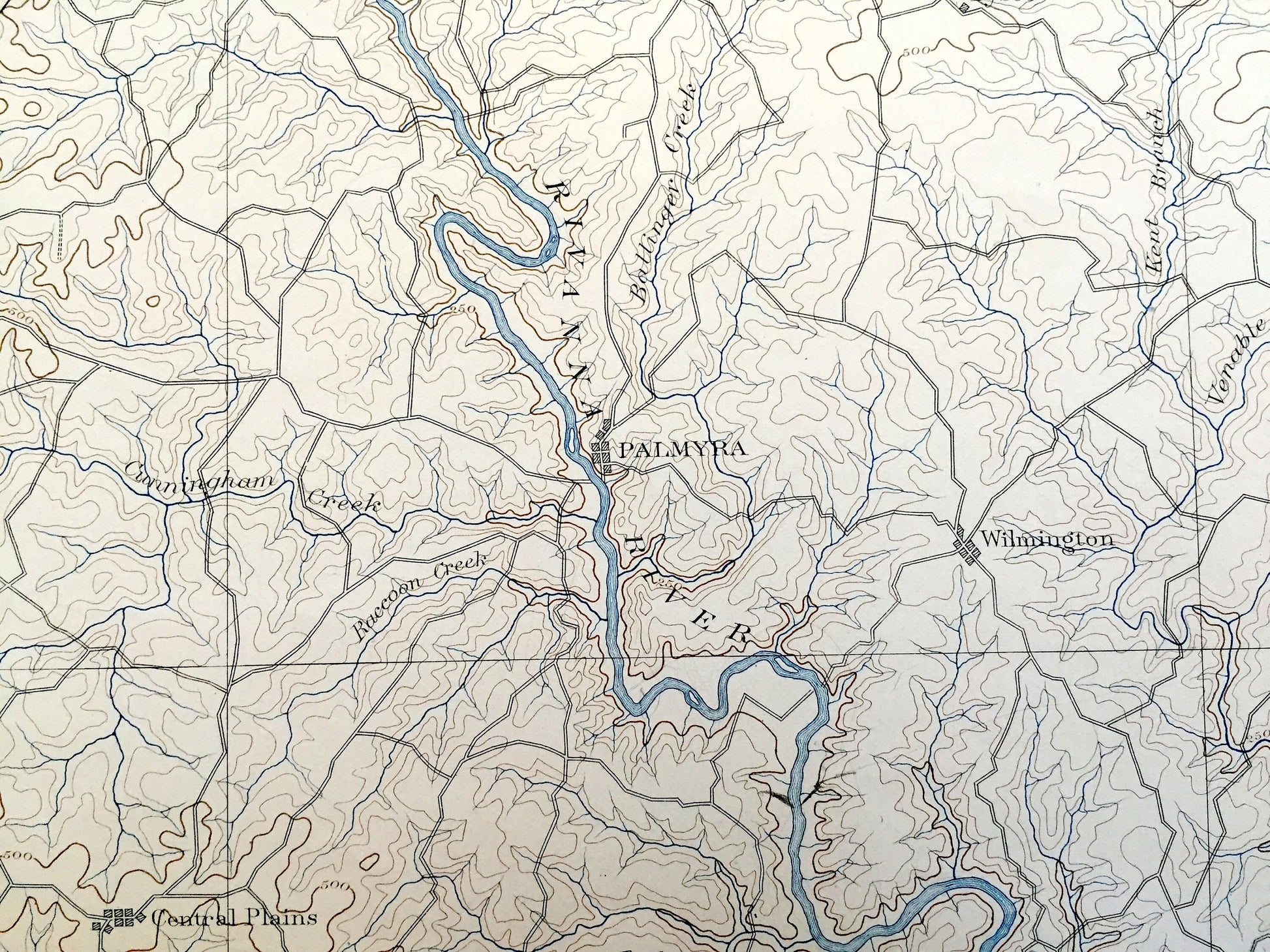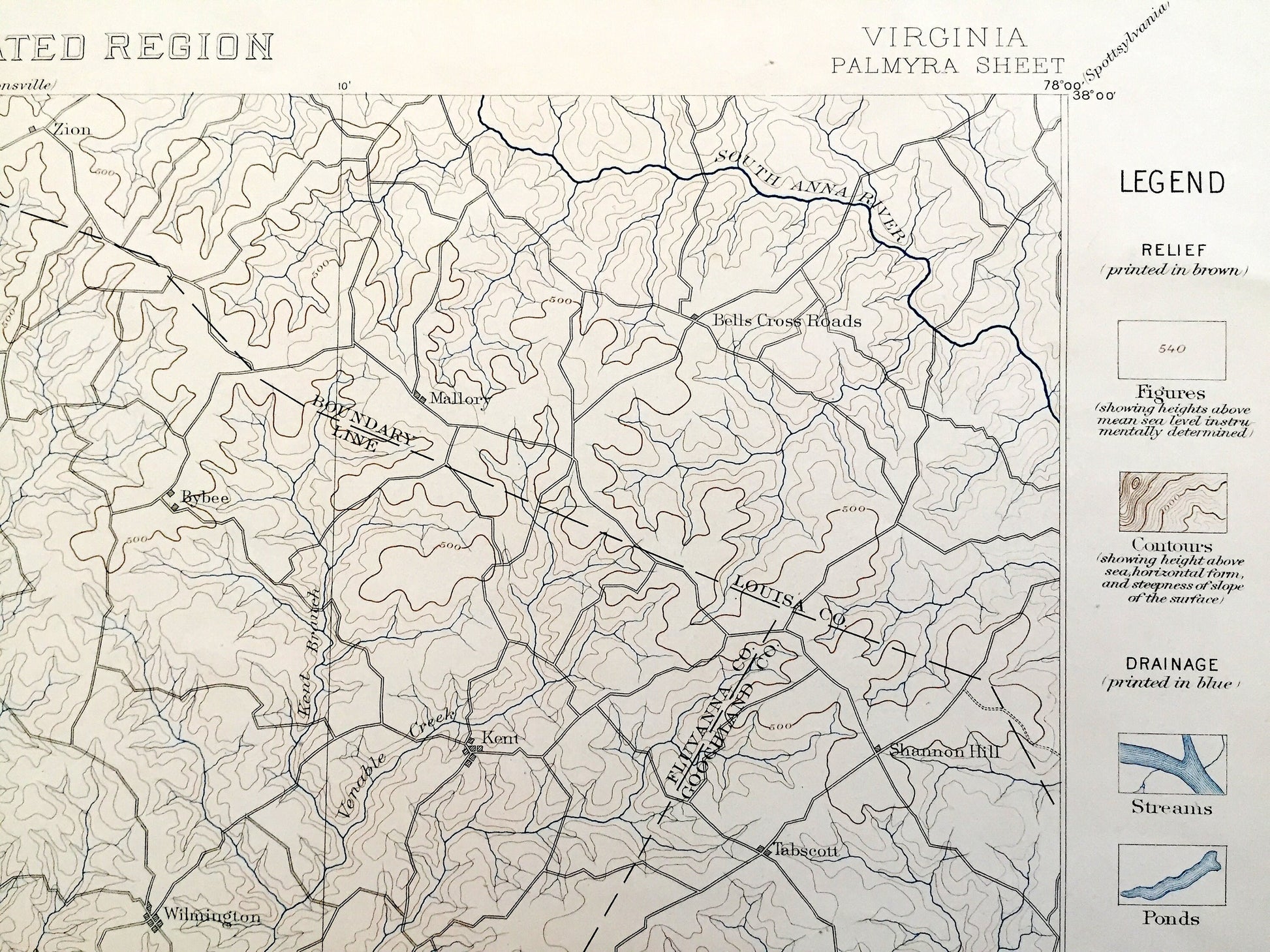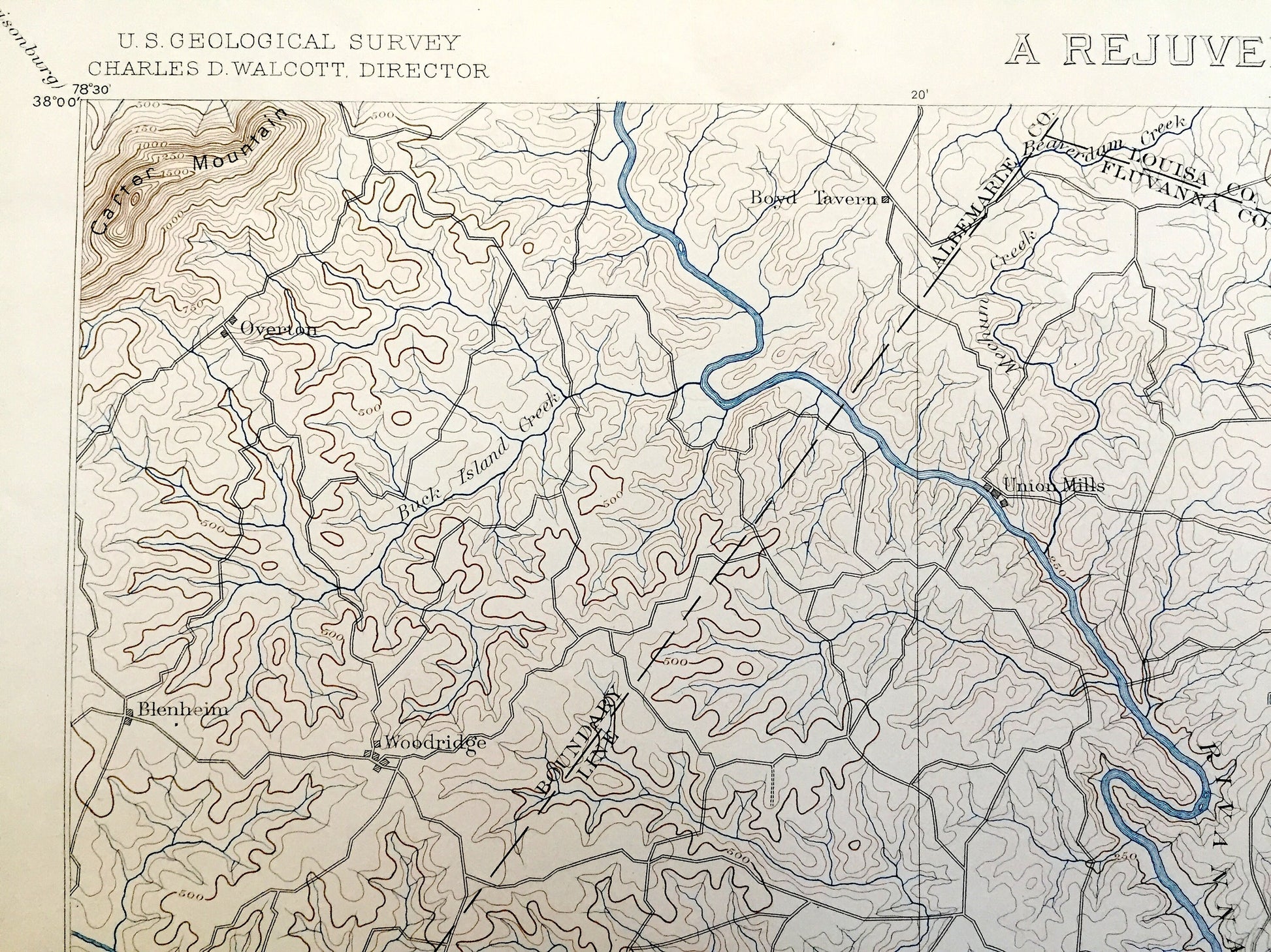 Beautiful, antique map of the Palmyra, Virginia and surrounding Fluvanna, Luisa, Buckingham, Cumberland & Alebermalre County area on the James River. This is an authentic 1888 print from the U.S. Geological Survey and NOT a computer reproduction. It is from a Geologic Atlas folio and features the rare heading "A Rejuvenated Region."