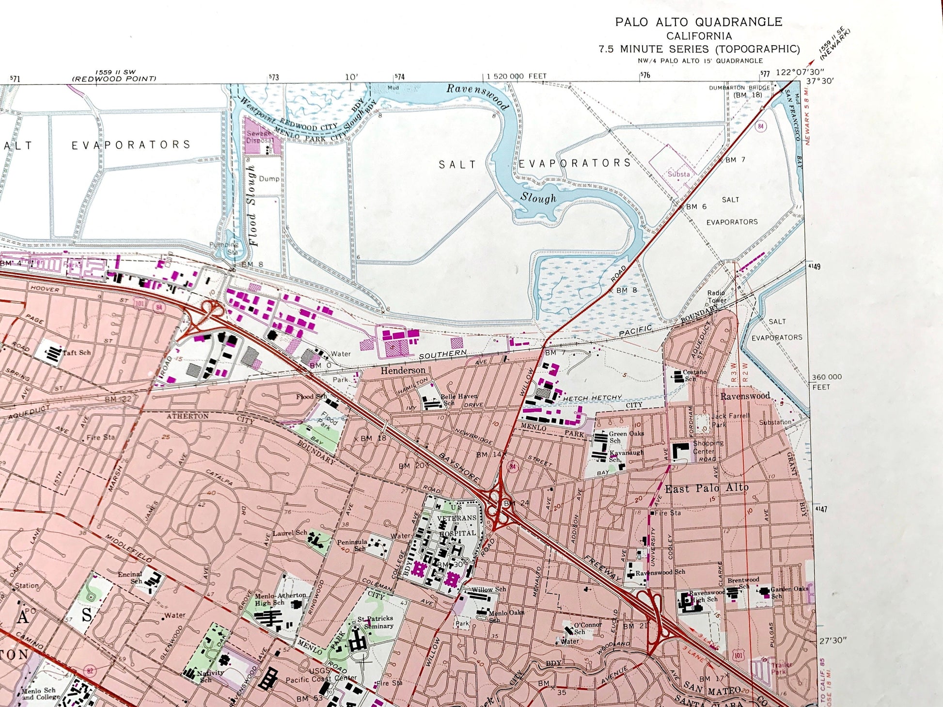 Antique Palo Alto, California 1961 US Geological Survey Topographic Map – Silicon Valley, Stanford University, Menlo Park Pulgas Atherton CA