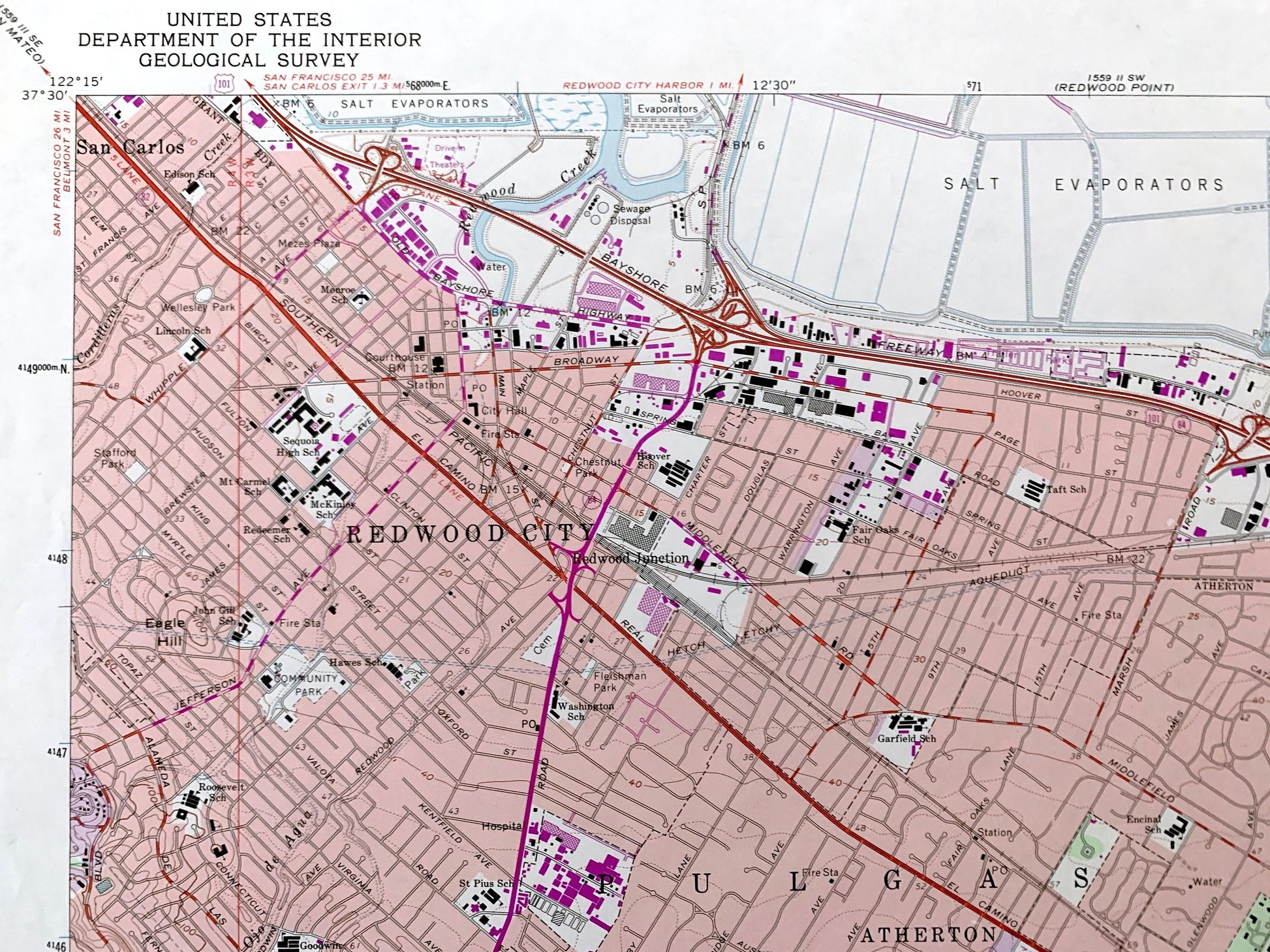 Beautiful, antique map of Palo Alto and surrounding San Mateo County & Santa Clara County areas. This is an authentic 1961 edition, 1974 print from the U.S. Geological Survey and NOT a computer reproduction.