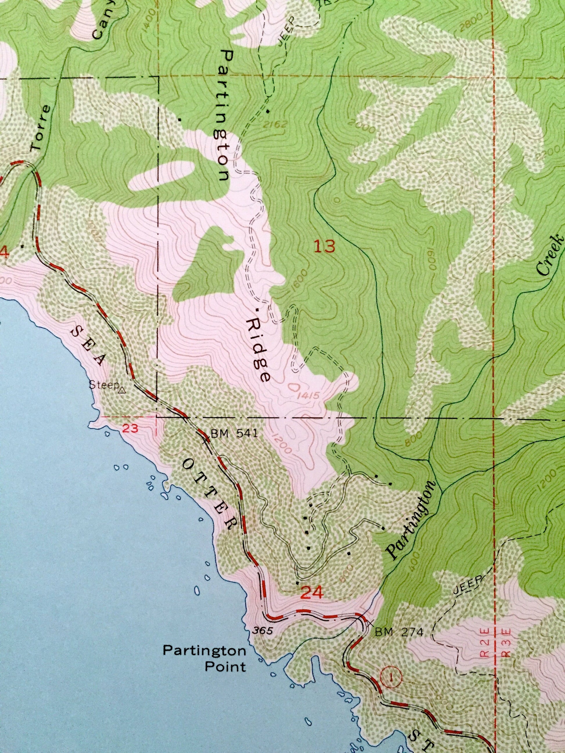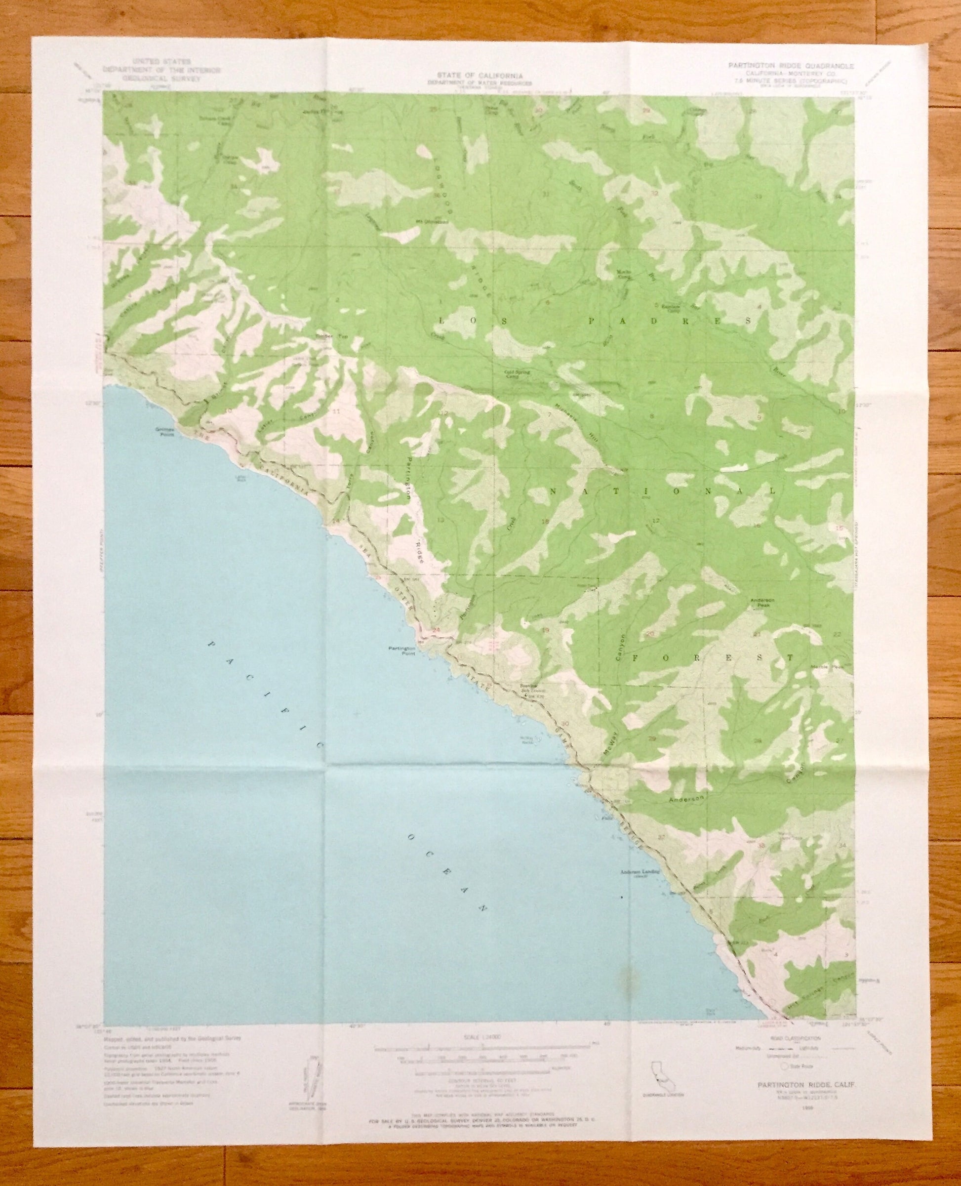 Points of Interest: Partington Ridge, Pacific Ocean, Los Padres National Forest, Logwood Ridge, Anderson Canyon, Mt Olmstead, Michaels Hill, Grimes Point, Partington Point, McWay Canyon, Anderson Peak, The California Sea Otter State Game Refuge, and many more hills, streams, ponds, houses, schools, churches and roads.