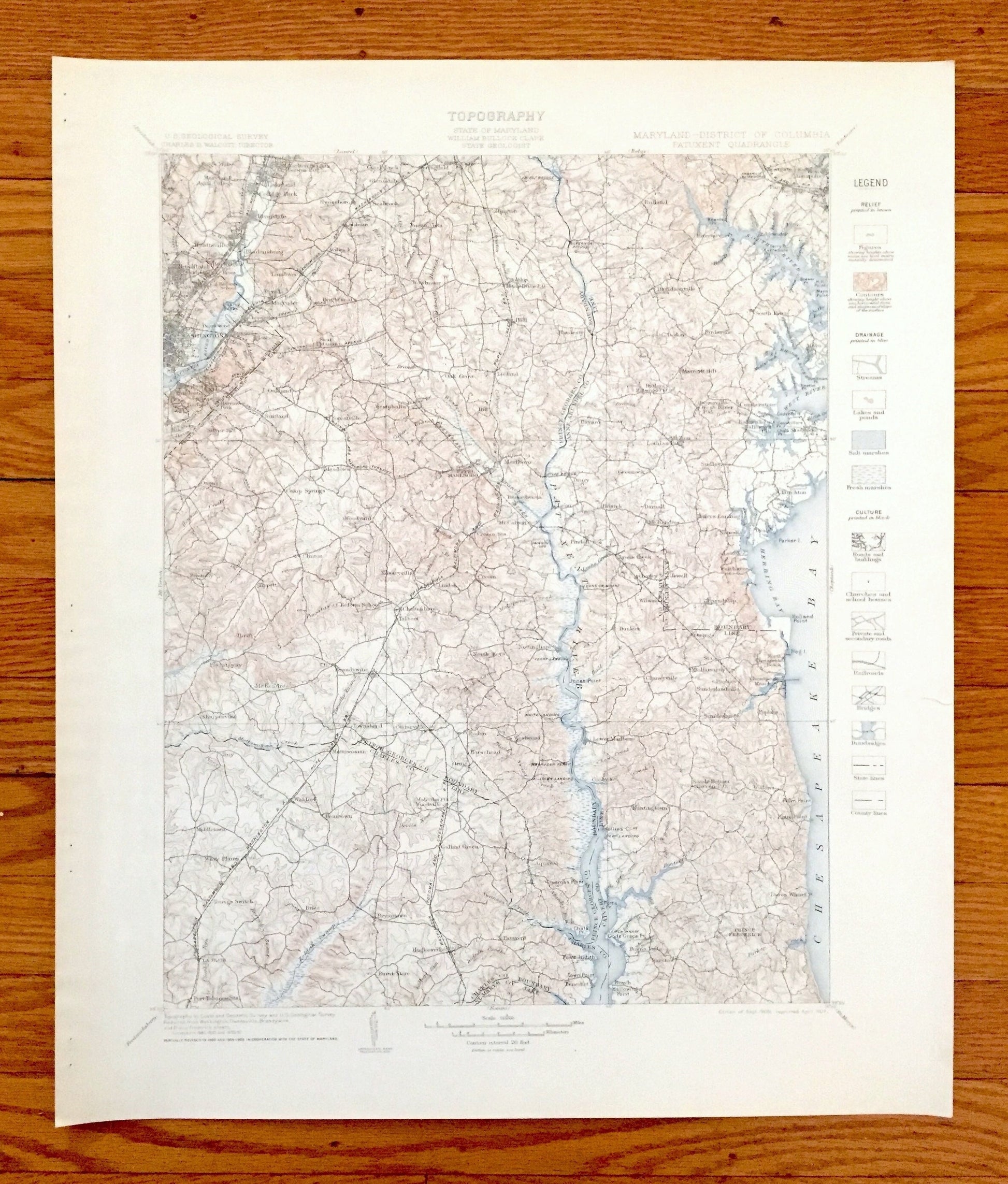 Beautiful, antique map of Maryland, including Washington, DC and West Annapolis, as well as Prince George's County, Anne Arundel County, Charles County, Calvert County, Maryland and the Chesapeake. This is an authentic 1906 edition, 1907 print from the U.S. Geological Survey and is NOT a computer reproduction.